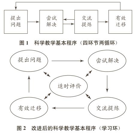 概念的逐步建构过程也就是学生思维不断发展的过程。科学教学的基本程序从宏观上决定了科学课堂是否有助于促进学生的思维发展和概念形成。从21世纪初开始,我 们努力在借鉴国内外有关“探究学习”“思维型课堂教学”等理论与实践基础上,逐步形成本区域内被广泛认同的科学教学基本程序。最初是以“四环节两循环”为特征的科 学教学基本程序(如图1所示);此后,借鉴“5E”模式,又将科学教学基本程序调整改进为如图2所示的学习环。[1]