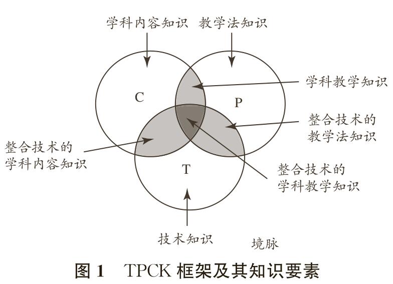 麦修和潘亚于2006年提出的“整合技术的学科教学知识框架(TPACK)”[4],拓展了舒尔曼1986年对教师所需知识特征的 定义,剖析了技术知识在信息化环境下教学中的重要作用,并认为是以下三种知识构成了TPACK的基础:学科内容知识(CK), 指任何一门学科的知识内容,也是教师需要承担的教学内容;教学法知识(PK),指教师应当具有的有关促进学生学习的各种教学策略、教学方法与教学活动方面的知识;技 术知识(TK),指教师应当具有的,可以被整合到学科教学中去的各种传统与新兴的技术知识。