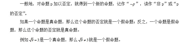 给出命题的否定之后,也可以指出,对一个命题进行否定,实际上就得到了一个新的命题。因为这两个命题中,必有一个为真,一个为假,所以我们在判断命题的真假时,可以转化成判断这个命题的否定的真假,从而得到原来命题的真假。