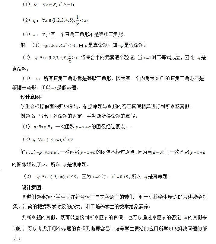量词命题的否定讲解时,从容易判断真假的命题开始,降低难度,讲完这些例子之后,可以在举些例题,把问题交由学生,让学生自己归纳总结得出相应结论,这样的结果孩子们印象深刻,培养学生勇于思考,善于思考的习惯。