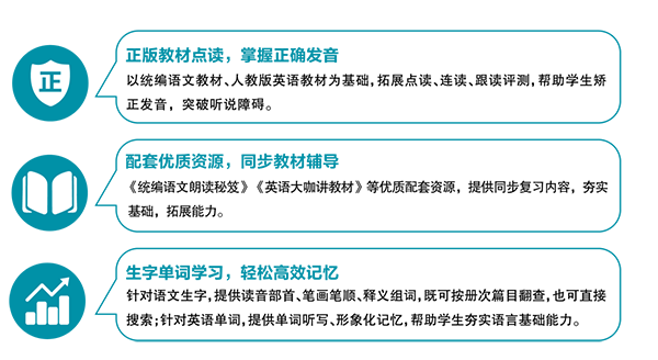 人教点读APP是由人民教育出版社官方出品的,面向全国中小学生的多学科移动学习应用。它以教材学习为核心,有效夯实基础知识,同步拓展课外知识,启发学习兴趣。它融合最新数字技术,创新内容交互体验、提供学习数据反馈,帮助学生进行自主学习,方便家长进行课业辅导。目前,使用师生遍及全国32个省(市、自治区),深受用户好评。