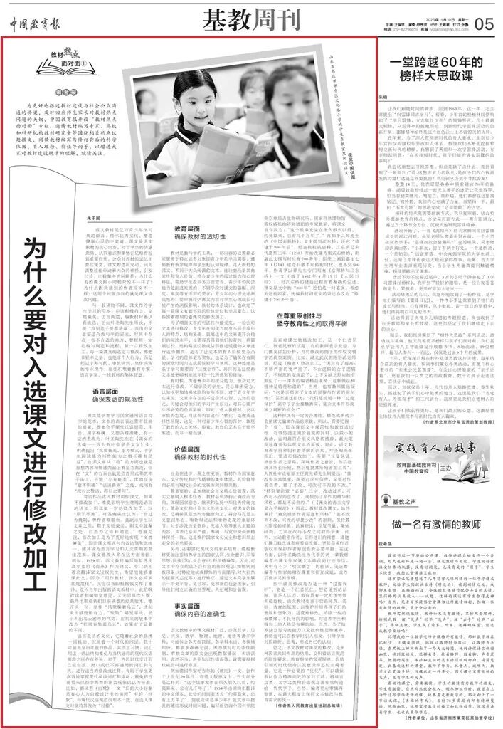 与一般读物不同,课文作为学生学习的范本,应该积极向上、文质兼美、语言典范,编教材时要认真挑选,正如叶圣陶先生所说,不能“捡到篮子里都是菜”。选出的文章要适合教与学的要求,对其中存在一些不合适的地方,要按照一定的编写规范和流程,做一点修改加工。每一篇课文的选定与修改,都绝非轻率之举,也绝非个人行为,而是经过字斟句酌、审慎研判、集体决策的专业操作,往往汇聚着教育专家、语言学家、一线教师的集体智慧。