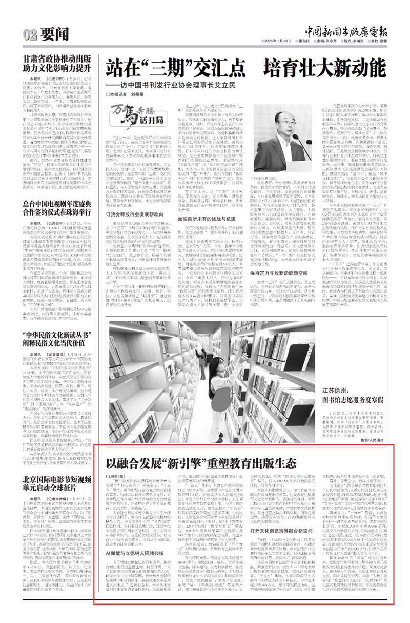 “‘十五五’时期是我国基本实现社会主义现代化夯实基础、全面发力的关键时期,党和国家对高质量教育和高素质人才的需求比以往任何时候都更加强烈。”人民教育出版社党委书记、社长黄强日前在接受《中国新闻出版广电报》记者采访时表示,教育出版在新时代肩负着服务国家战略、培养时代新人的重要使命。在变局中把握机遇、在挑战中开拓新局,成为推动教育出版高质量发展的时代命题。