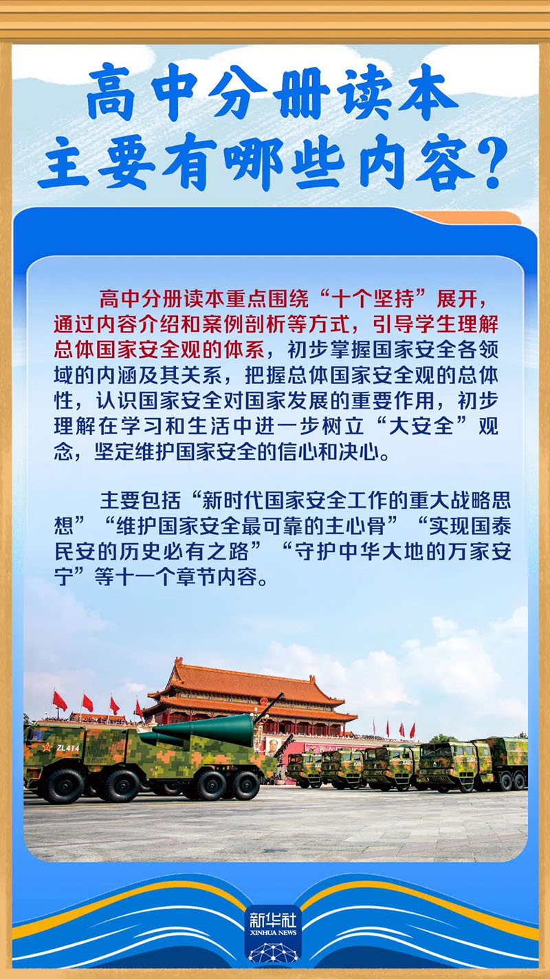今天是4月15日,第十一个全民国家安全教育日。近日,专为青少年学生编写的《国家安全教育中小学生读本》(以下简称“读本”)由人民出版社与人民教育出版社联合出版发行。这套读本包括哪些主要内容?是如何编写的?提到了哪些国家安全领域?跟随海报,一起了解。