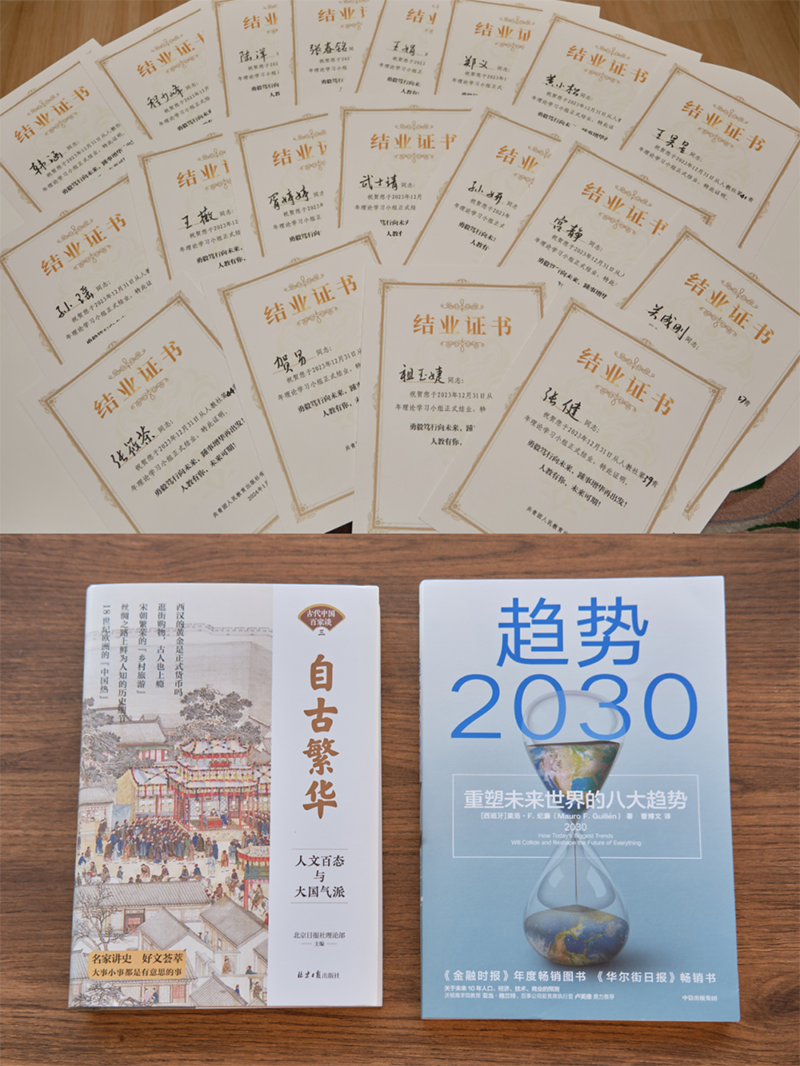 社团委向49位结业青年颁发了结业证书,并结合业务特点及青年学习需求,配发了《自古繁华:人文百态与大国气派》《趋势2030:重塑未来世界的八大趋势》两本“主席书架”图书。两本书一本重温源远流长而又多姿多彩的中华文化,一本聚焦未来社会相互迸发的变革力量,希望能以此激励青年在对历史的回溯与展望中坚定“四个自信”,拓展全球视野,通过踏踏实实的业务工作为强国建设和民族复兴贡献力量。