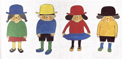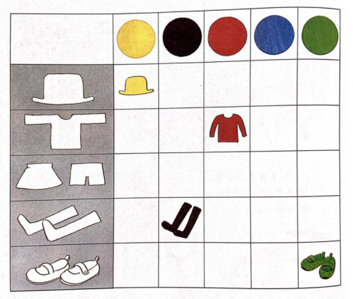 再来看一看,现在这几个小朋友穿戴的物品,应该在表格中对应的哪一行、哪一列呢?