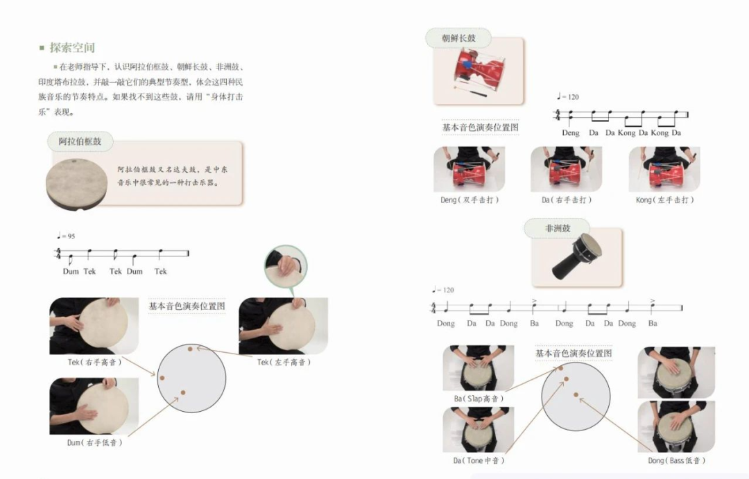 “世界民族音乐博览会”是第二单元的学习项目二,本堂课的教学内容为其中的“拓展探究”板块。教材中选用了世界不同地区、不同民族的四种鼓及它们的典型节奏作为教学内容。