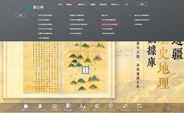 第一种:登录网址www.ancientbooks.cn进入“籍合网”首页;鼠标移入“数据库”根目录,点击进入《中华文史工具书数据库》。