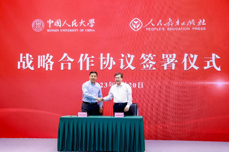 中国人民大学党委书记张东刚表示,中国人民大学和人民教育出版社都具有鲜明的红色基因和优良传统,以立德树人为根本任务,有着共同的使命担当。签订战略合作协议,对于加快大中小学思想政治教育一体化建设,推进新时代教材建设高质量发展,助力强国建设、民族复兴具有重要意义。中国人民大学将与人教社团结奋斗,打造“培根铸魂、启智增慧”的精品力作;打造“赓续文脉、守正创新”的精品力作;打造“勇立潮头、与时俱进”的精品力作。两家将团结携手,力争在强国建设、民族复兴的新征程上作出新的更大的贡献。