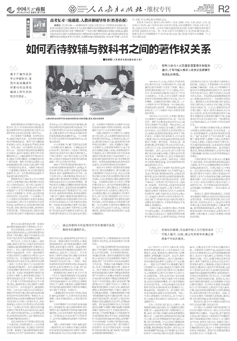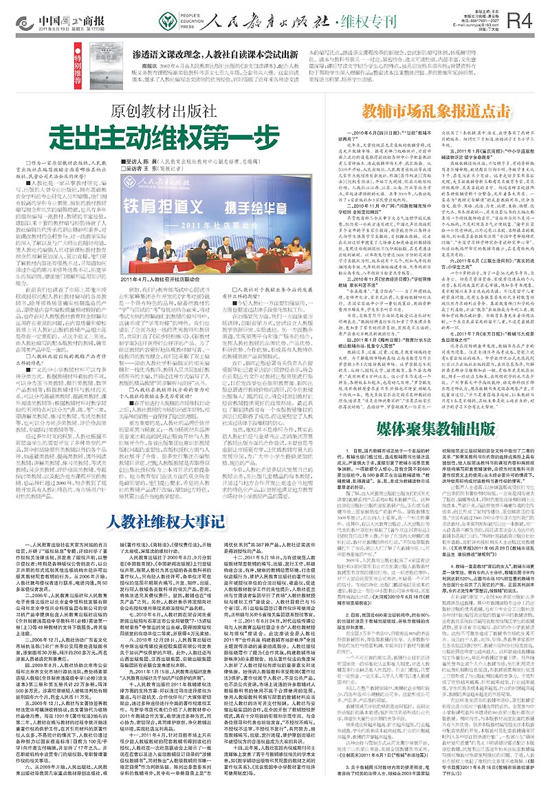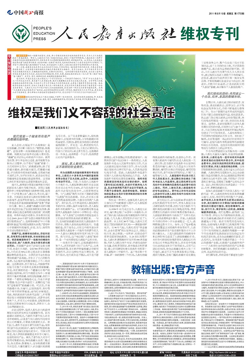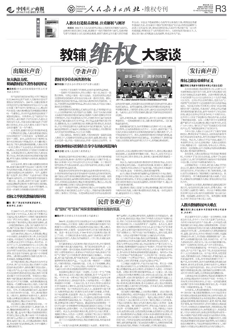 毫无疑问,中国正在进入也必将进入一个学习型社会、一个终身学习的时代,“学习”不仅仅是每个人无一例外的成长经历,更是每个人生存的必需,教材与教辅都还会是今后出版业的主角。如今市场上的教辅读物出版的种种问题,不仅给中小学生学习造成不同程度的危害,也带来了腐败等多种社会问题。越来越多的出版人意识到,出版之于教育不再只是一种依赖关系,出版业特别是教育出版对于教育有着一份企业社会责任。人教社从2010 年年底开始大力推进教辅维权,就是这样一种企业社会责任感的表现。本期“人民教育出版社维权专刊”的推出,就是希望能够传达这样一种态度:教辅维权不只关乎利益,更是出版人对于服务教育、净化市场从而推进教育发展的责任所在,是关系到千千万万学子乃至中国的未来! |