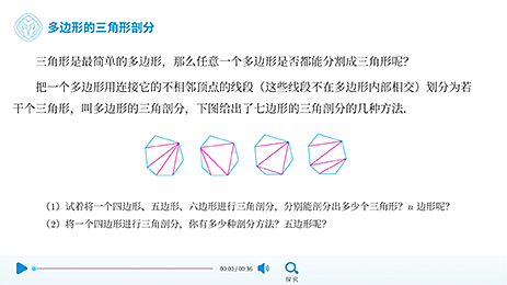 本资源采用交互动画的形式,让学生通过画图,自主探究对选定的多边形进行三角剖分的方法,归纳总结 n 边形的不同三角剖分方法数。