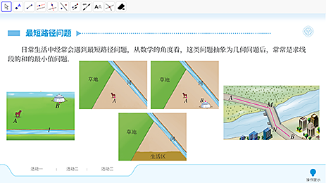 本资源采用交互动画的形式,为学生提供活动任务栏目中的3个活动任务模拟探究场景,通过拖动点的位置、度量线段长度等功能,探究牧民饮马和造桥选址问题的最短路径。
