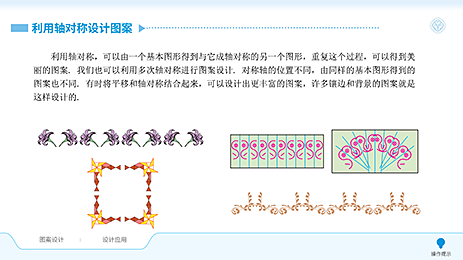 本资源采用交互动画的形式,为学生提供一个可以通过对选定或是自行绘制的图形(图案)进行轴对称或平移变换,从而设计出个性化的美丽图案。