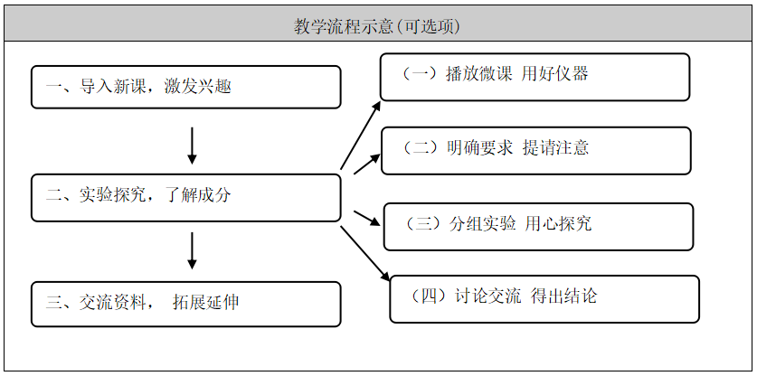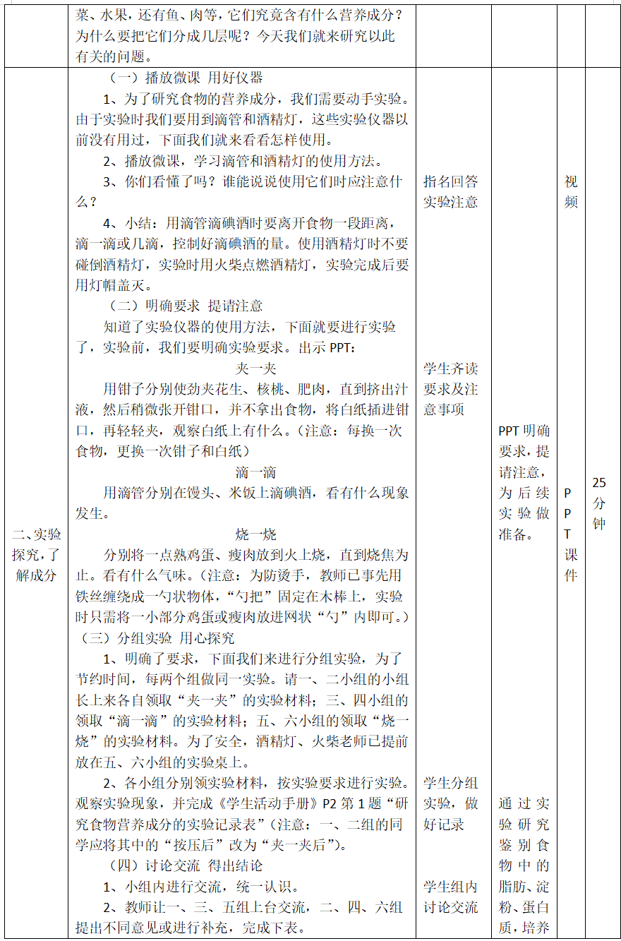 学习内容:重点让学生探究食物中有哪些营养成分。学习目标:知道人体所需要的营养成分主要从食物中获得;能通过实验研究和收集资料了解食物的营养成分和作用;学会正确使用滴管和酒精灯;能按营养成分给食物分类;乐于进行探究活动,体验探究的乐趣;意识到食物多样化的必要性,丰富对食物中营养成分的认识。