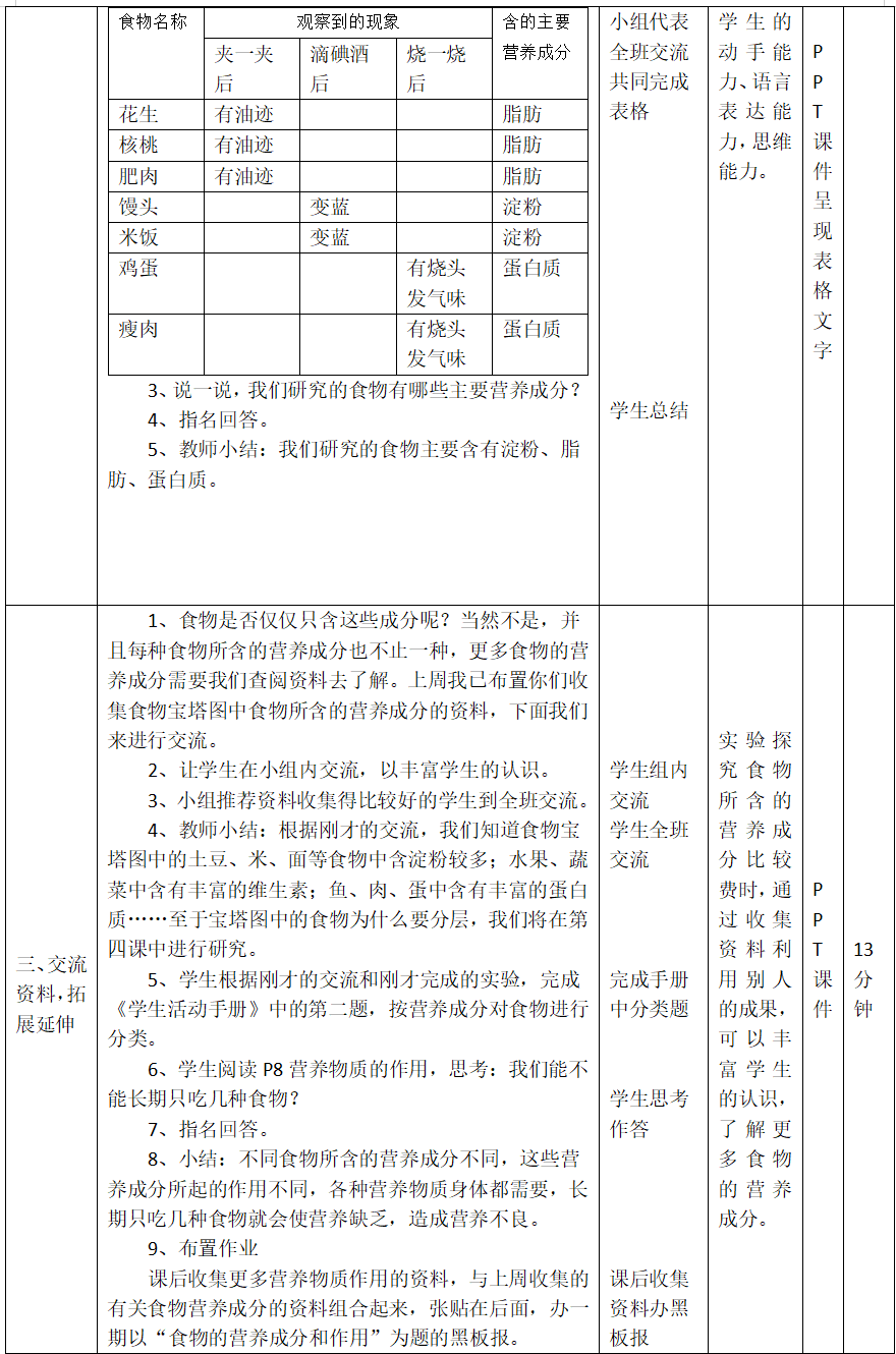 学生通过实验,鉴别食物中含有脂肪、淀粉、蛋白质等营养成分;通过交流收集的资料认识更多食物的营养成分和作用。