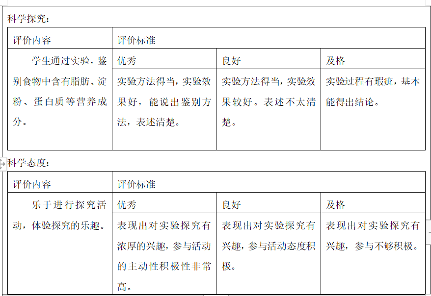 科学探究:滴管、酒精灯这些实验仪器,学生不会使用,怎样通过实验鉴别食物的营养成分,学生也不会,这些都需要教师细心指导。但学生能通过实验观察描述、讨论交流,因为他们已经有了两年的学习基础。