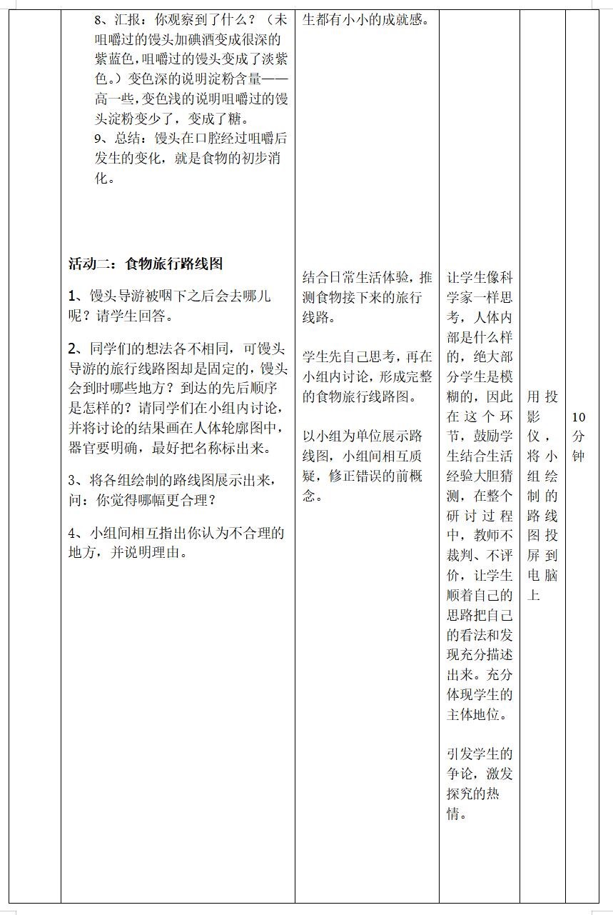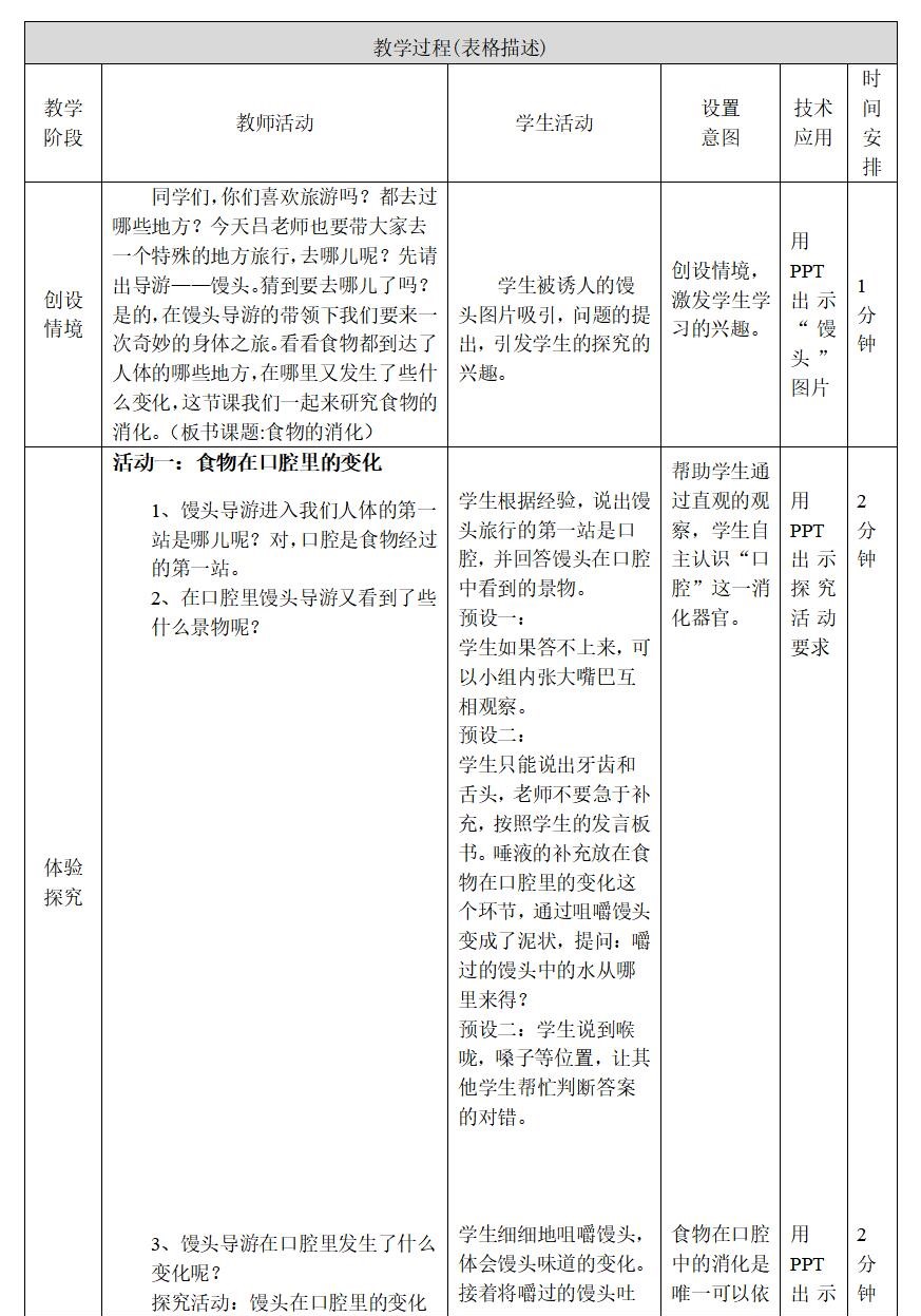 《食物的消化》在新版《义务阶段小学科学课程标准》中属于“生命科学领域”。《课标》中提到:教师应指导学生,通过观察、调查、讨论等多种途径,初步认识人体的结构组成,以及保健常识,进而形成健康生活的意识,养成良好的生活和行为习惯。在设计上我采用探究式的学习方法,从提出问题、探究问题到表达与交流探究成果,整个过程以学生为主体,大部分时间都是学生在动手做,对比观察,思考现象背后隐藏的科学道理,交流各自的看法。在这一过程中,学生体会到了科学探索的真谛,不仅能提高学生的能力,还让学生对消化过程有了清晰的认识,使学生经历了一个比较完整的探究过程。