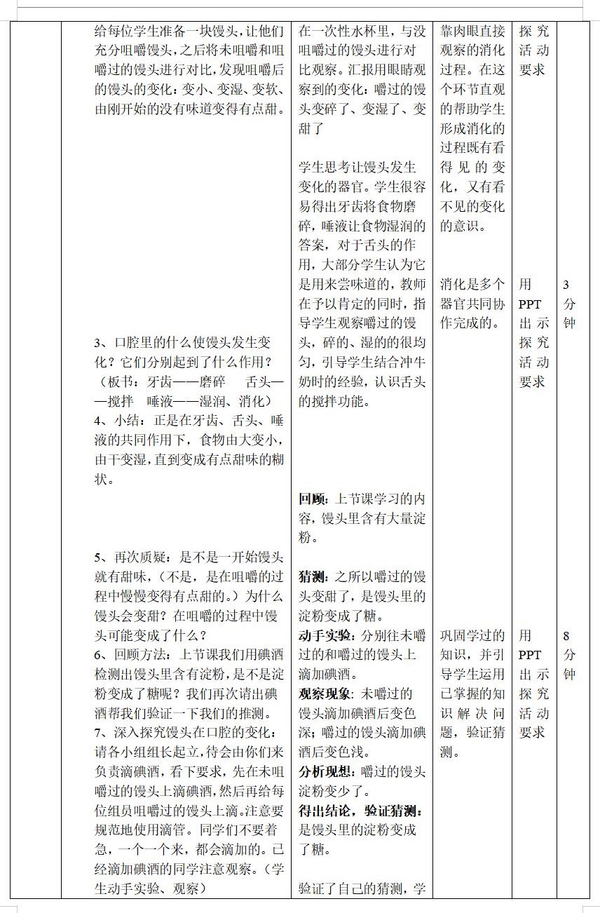 跟以往的课堂一样我也设计了让学生吃馒头,体会馒头的味道变化,但没有止步于此,而是进一步设计探究活动,让学生猜测是什么馒头变甜了,结合本单元第二课《食物的营养》中学到的检验食物营养的方法,通过分别往没有咀嚼和咀嚼过的馒头滴加碘酒的方法,让学生观察实验现象,得出馒头里的淀粉变少了,变成了糖。消化不仅有我们看的见的物理变化,还有看不见的化学变化,针对三年级的学生不用讲的太深,但在学生的心中建立起这种认识,为以后的学习打下基础。
