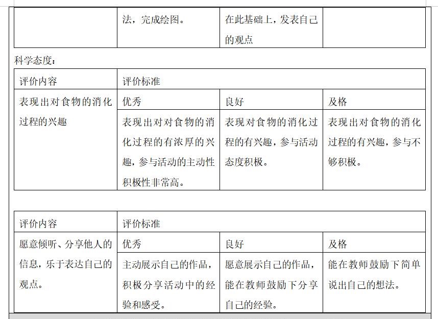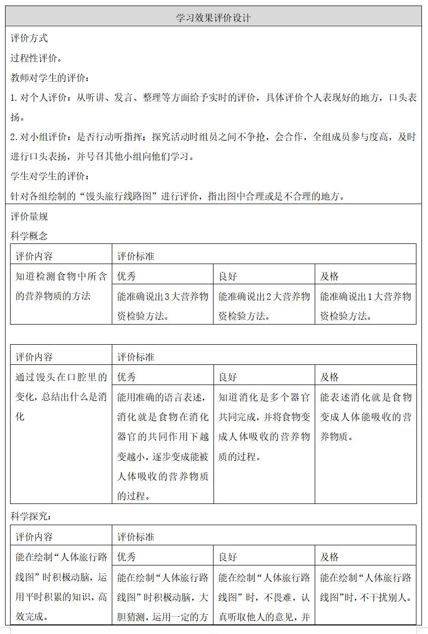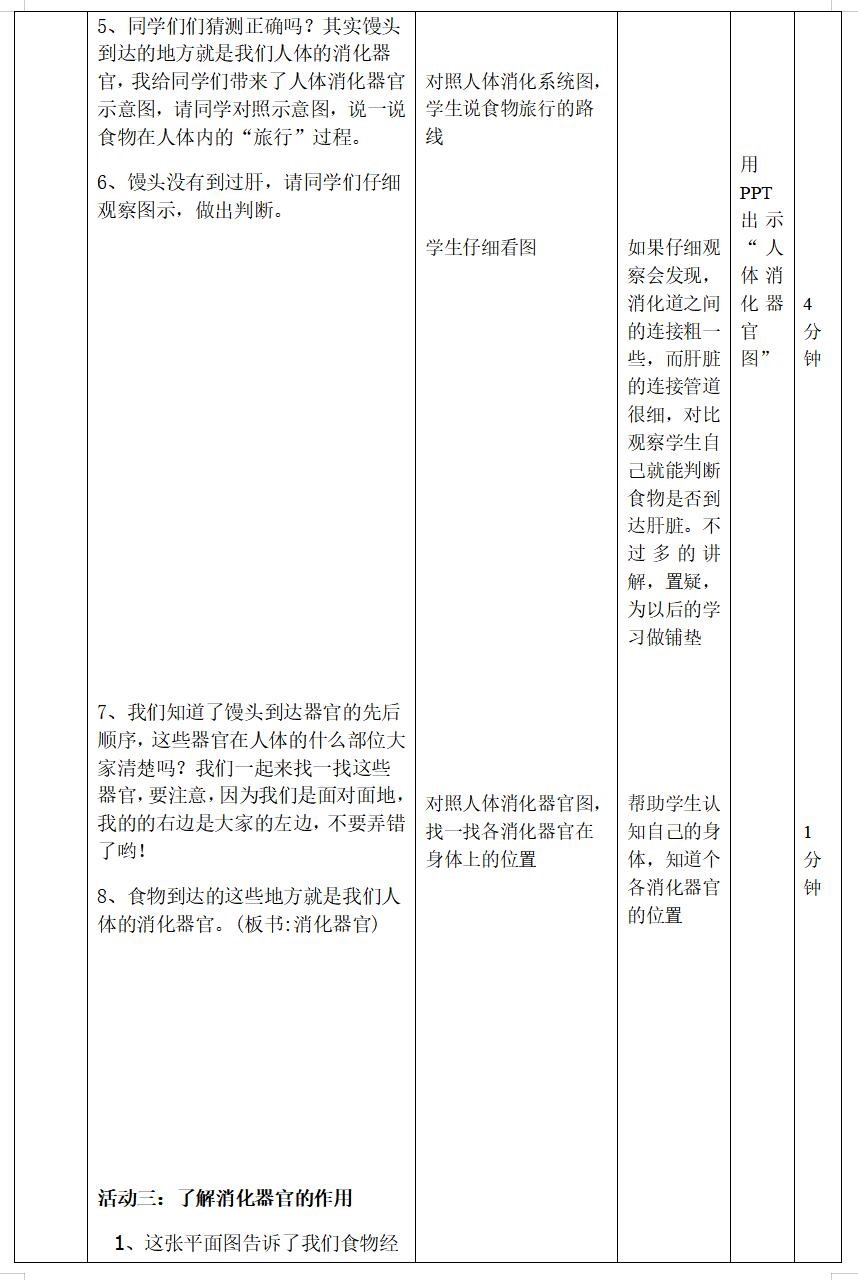 学习目标:在老师的指导下,用科学的语言描述食物在体内消化的过程,知道消化是由多个器官共同协作完成的。初步养成用事实说话的意识。