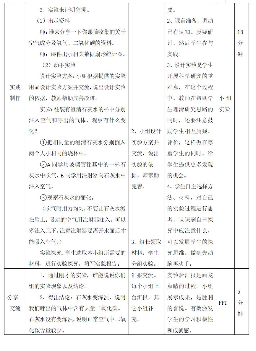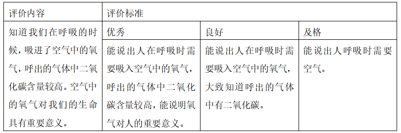 2、知道我们在呼吸时,吸进了空气中的氧气,呼出的气体中二氧化碳含量较高。认识到空气中的氧气对我们的生命具有重要意义。