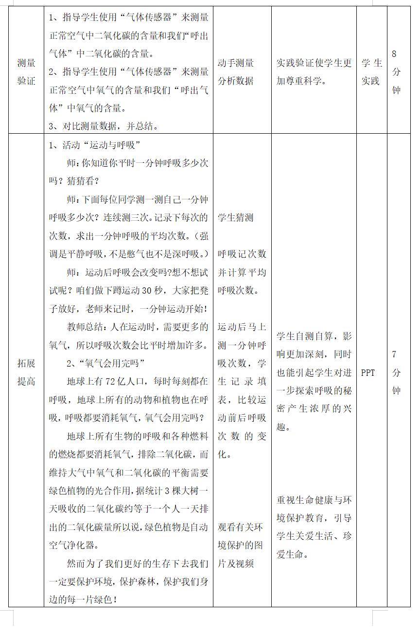 本节课本着体现新课程的基本理念而设计,促进全体学生的最佳发展,着眼学生基本素养的全面提高,引导学生生动活泼地主动学习,面向全体学生,以探究为核心课程具有开放性。积极倡导让学生亲生经历一探究为主的学习活动,培养他们的好奇心和探究欲望,使他们学会探究解决问题的策略为他们终生学习打好基础。教学中建立学习目标,激起学习需要。以情境和目标任务来唤起学生内在的积极性。我在教学过程中采取科学游戏“憋气游戏”,在游戏过程中激发学生的学习兴趣,让学生通过游戏更深刻地体会到呼吸对我们的重要性。然后围绕着学习的目标和任务,动手、动口、动脑,进行各种实践,不断试探最好的解决问题的操作方式。在实践中,老师引导学生明确方向,探究操作活动的线索,在关键问题上给与提示。在研究“人体吸进与呼出的气体是否相同”环节中我才用实验法,给学生提供亲自动手操作的机会,培养学生的观察能力,探究能力,在实验过程中小组合作讨论共同探究,培养了学生合作交流乐于助人的精神。学生在教师的指导下将获得的结果与过程结合起来,及感受知识结论又理解了知识的产生和发展过程。