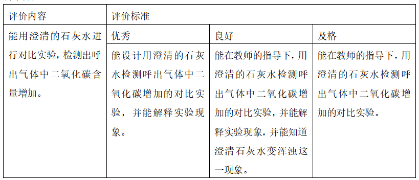 3、能用澄清的石灰水做对比实验,检测出呼出气体中二氧化碳增加了,初步体验用比较的方法研究人体内不能直接观察到的生命活动。