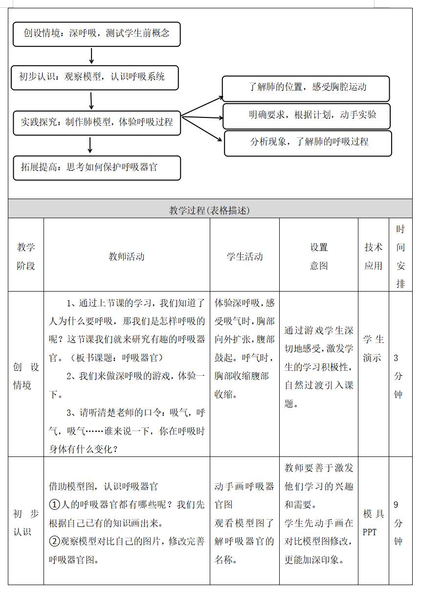 学习内容:认识呼吸器官,了解吸进的空气与呼出的气体在身体中流经的途径。