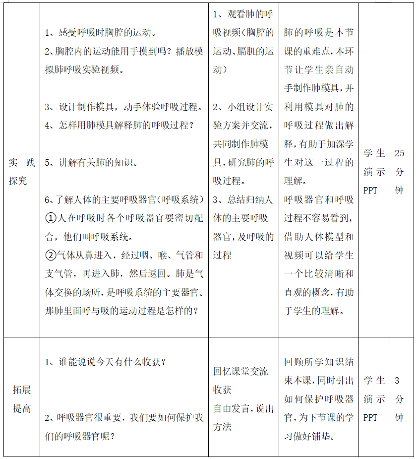 本课教学环节层层递进。先让学生做深呼吸的游戏感受呼吸时身体部位的变化,学生会对身体的变化感到好奇,从而想了解身体里是怎样呼吸的。接下来教师要求学生根据自己的理解画出参与呼吸的器官,再借助模型和视频认识呼吸器官,通过制作肺模型了解肺呼吸的过程,最后通过测试肺活量鼓励学生多进行体育锻炼。通过亲自体验活动,学生的语言表达能力也得到提升。