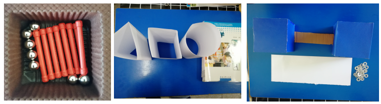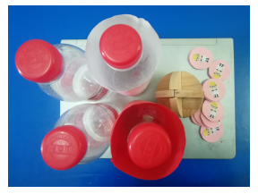 1.教师:空矿泉水瓶2个,螺母粘贴在瓶内一个上一个下的矿泉水瓶分别一个,外面套纸套,板子,建筑师徽章多枚、鲁班球、PPT.