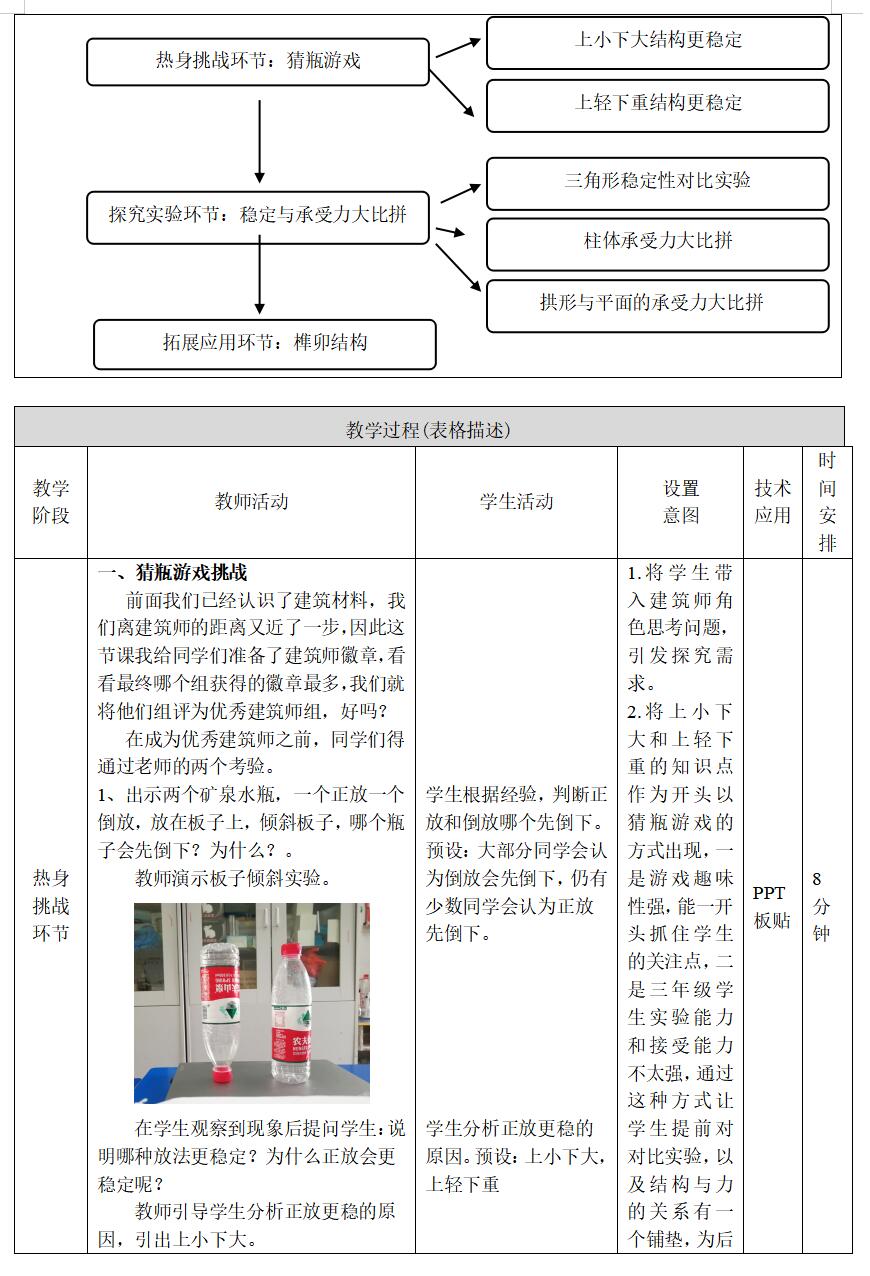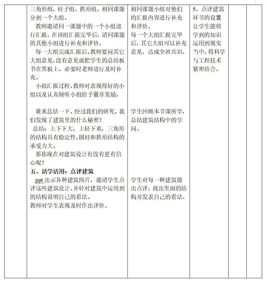 教学重点:学生通过对比实验认识到三角形、上小下大、上轻下重的结构具有稳定性,并能指出圆柱比其它柱体承受力强,拱形比平面承受力强。