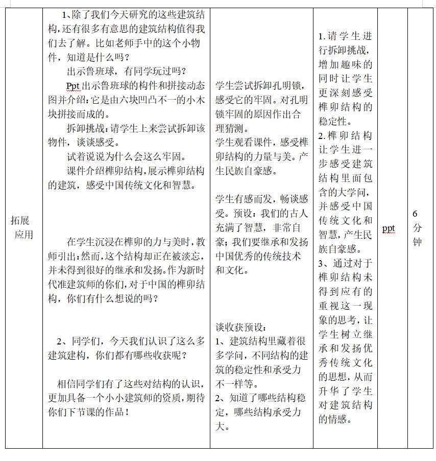 在教学中,我从猜瓶游戏出发,让学生带着建筑师的角色开启趣味的知识之旅,在游戏中认识几种结构后,接着通过观察各种建筑图形找出其它结构,并猜测不同结构力的作用效果,然后再设计实验,通过实验来证明自己的猜测,这又是科学学习中的探究学习过程,在这个过程中,学生像科学家一样去寻找答案,获得了科学知识。而科学知识并不是最终目的,科学知识的获得是为了将其转化为建筑设计上可被应用的理论或工具。通过以建筑师身份赏析各种建筑,让学生学以致用,对建筑的结构及特点再次重温,并产生强烈的角色感。最后通过中国古代榫卯的介绍,让学生感受到建筑结构的博大精深,对建筑结构的情感再次升华。