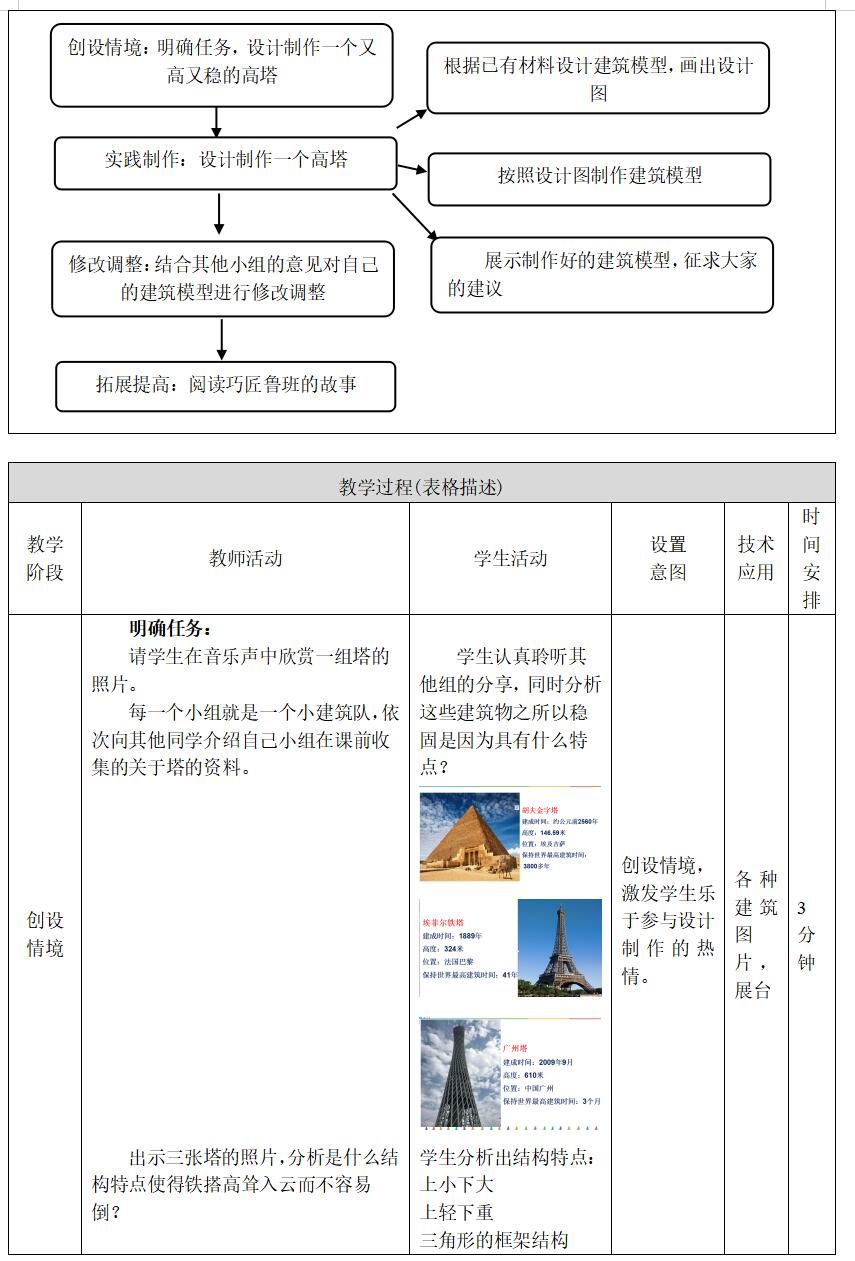 《设计制作建筑模型》在新版《义务阶段小学科学课程标准》中属于“技术与工程领域”。《课标》中提到:技术与工程领域的学习可以使学生有机会综合所学的各方面知识,体验科学技术对个人生活和社会发展的影响。技术与工程实践活动可以使学生体会到“做”的成功和乐趣,并养成通过“动手做”解决问题的习惯。三年级的学生对于动手制作有着强烈的兴趣,所以本课设计了活动:利用胡萝卜和牙签制作高塔。每个环节中包含了小活动:欣赏历史上的各种建筑并分析其特点;小组合作画出设计图并制作;交流活动,分享经验;拓展提升。教学环节层层递进,使学生在每个环节都接受新鲜的刺激,从而持续产生上课兴趣,达成目标。