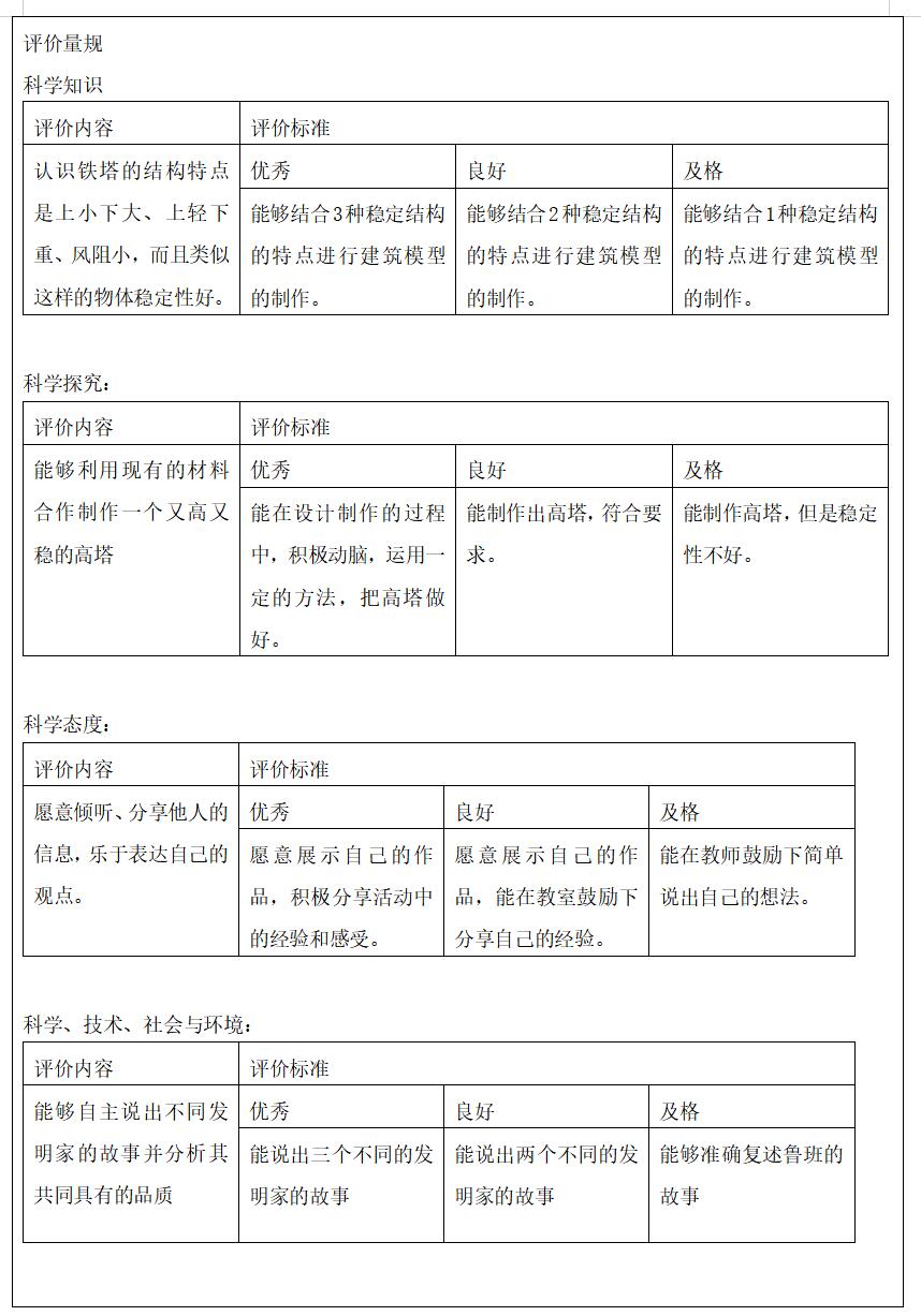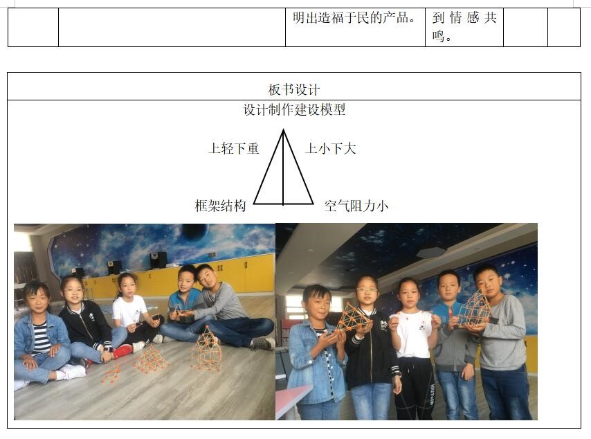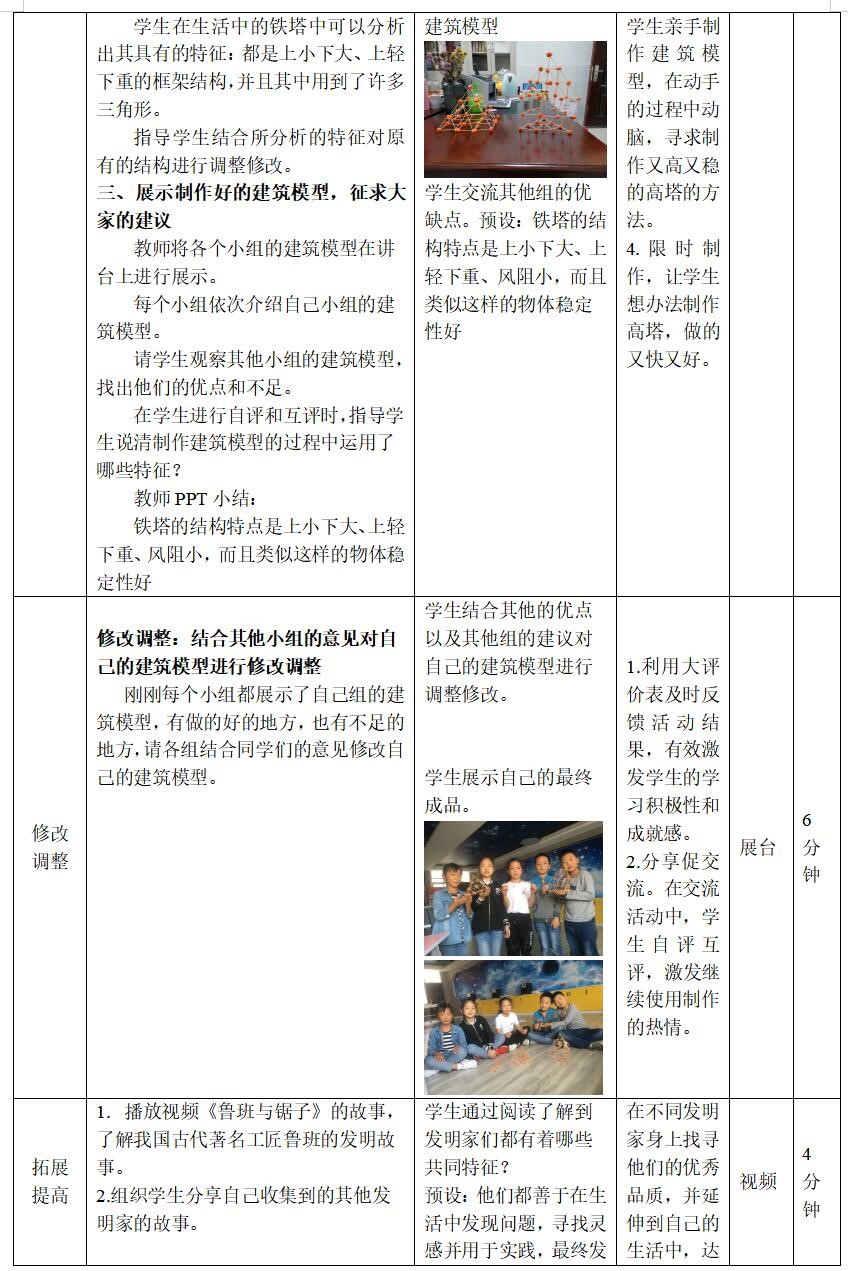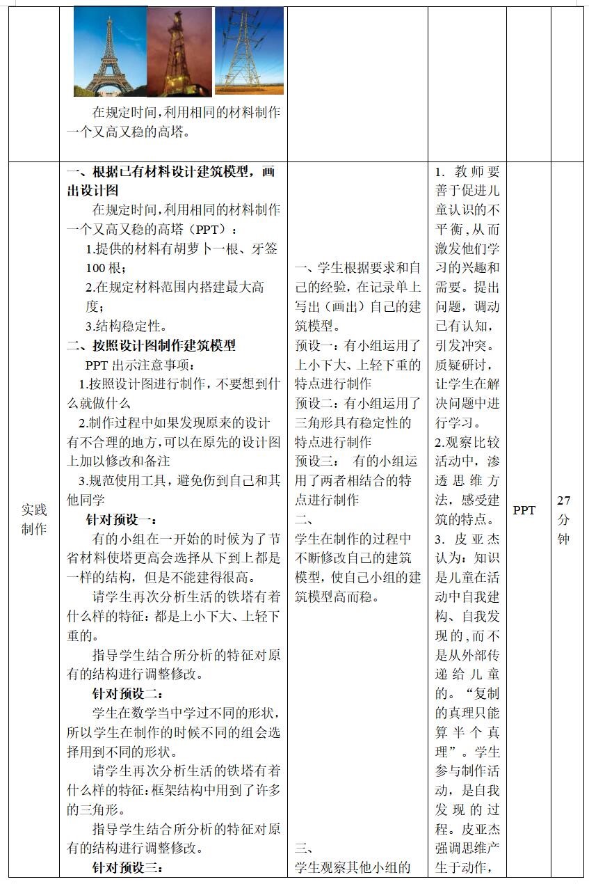 在教学中,我从学生对已有的著名建筑的认知开始,分析这些建筑历史悠久的原因,内化为自己的语言,表达出要使一个建筑更稳定需要满足哪些条件。再指导学生利用胡萝卜和牙签制作一个高塔。学生在这个过程中通过完成任务不断体会如何可以让自己的高塔高而稳定。在交流活动中,学生带着作品展示,很自然的将自己得感受与他人分享。本节课中重点体验的设计制作的过程,学生在活动的过程中体验成功的乐趣,并能够应用到自己的生活中,培养了学生的创新精神。