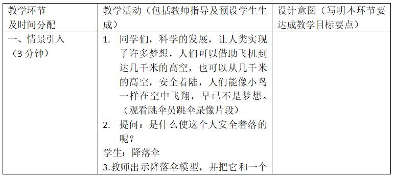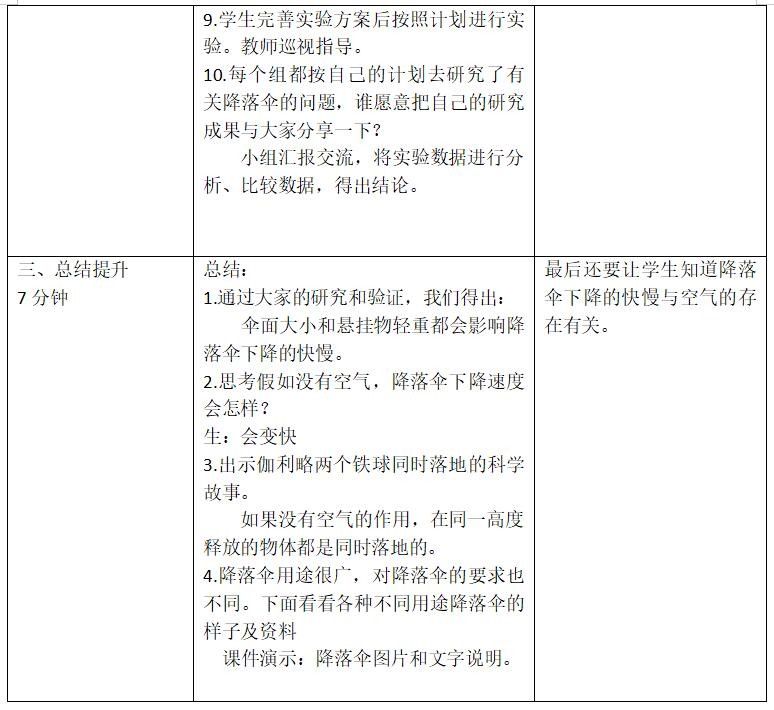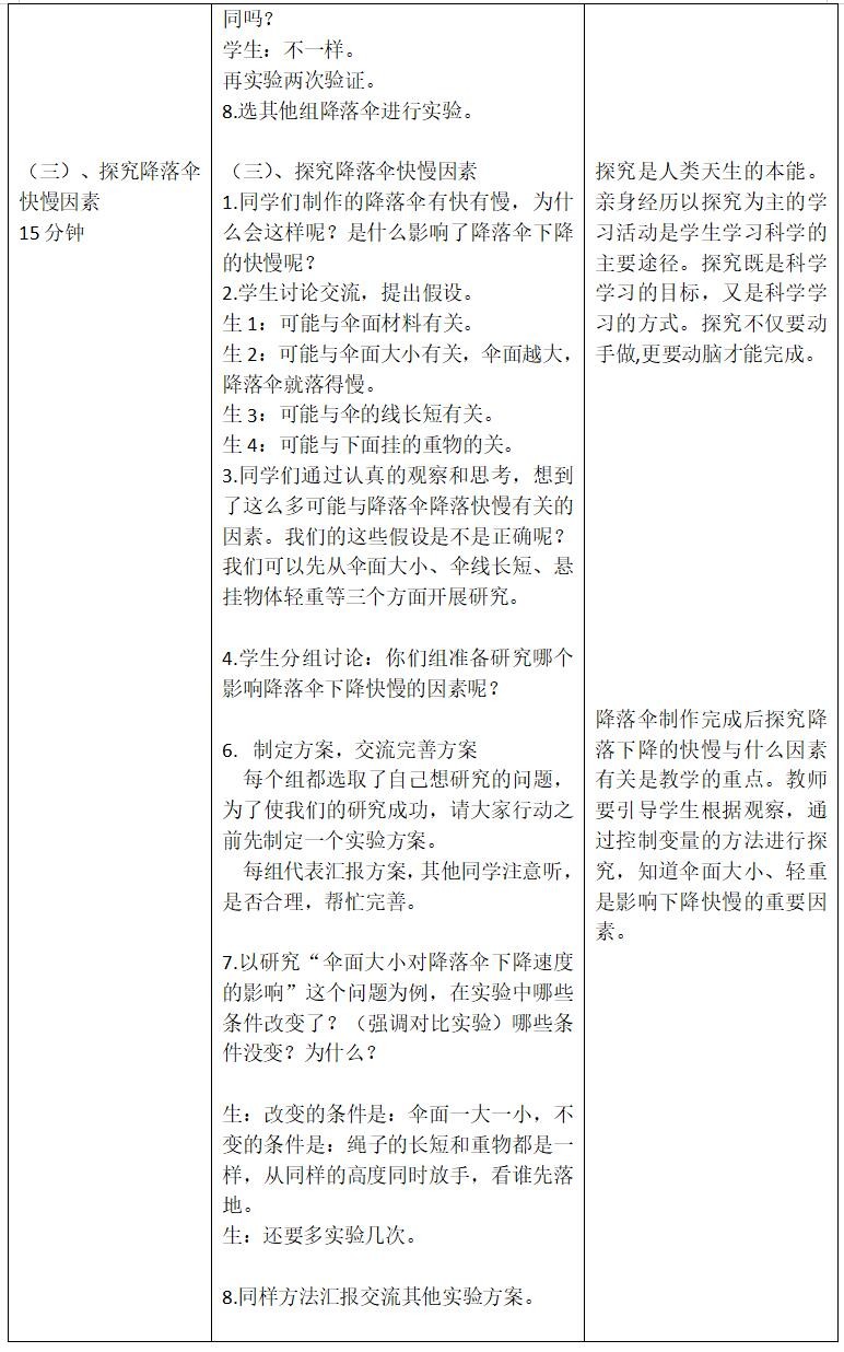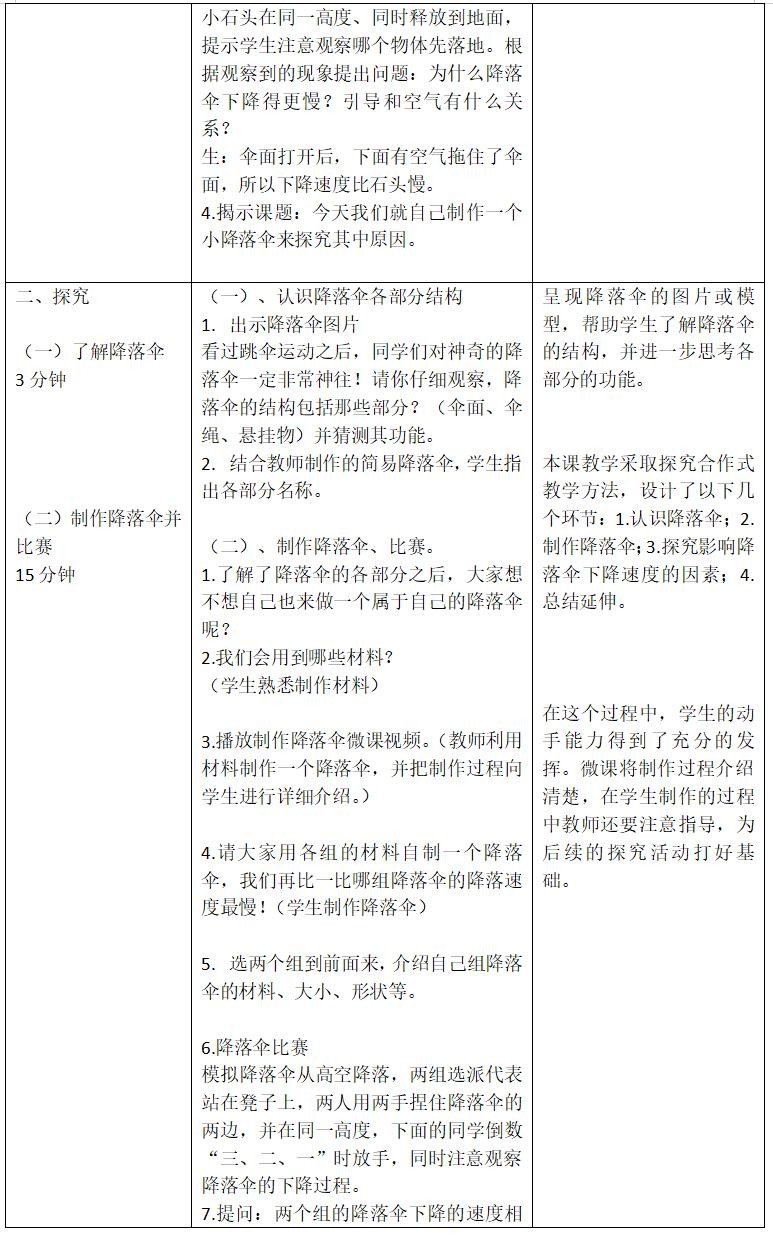 教学重点:猜想影响降落伞下降快慢的因素并能设计方案进行验证。