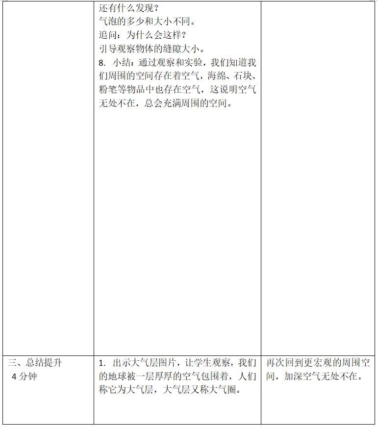 1.认识到我们周围的空间充满了空气,空气是无处不在的。