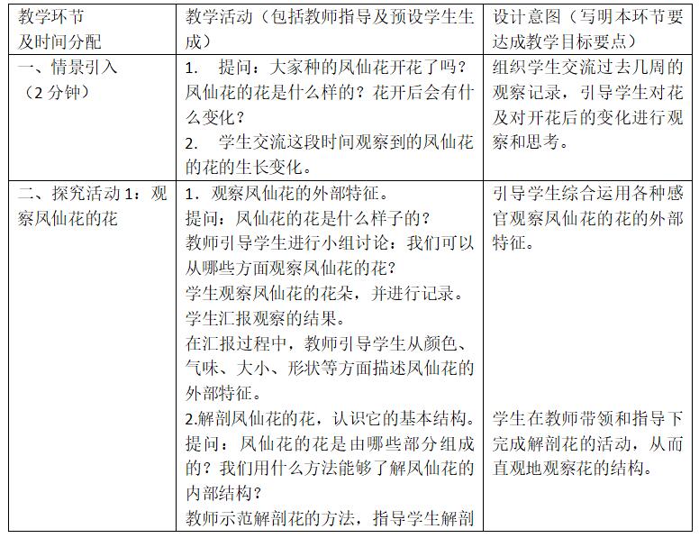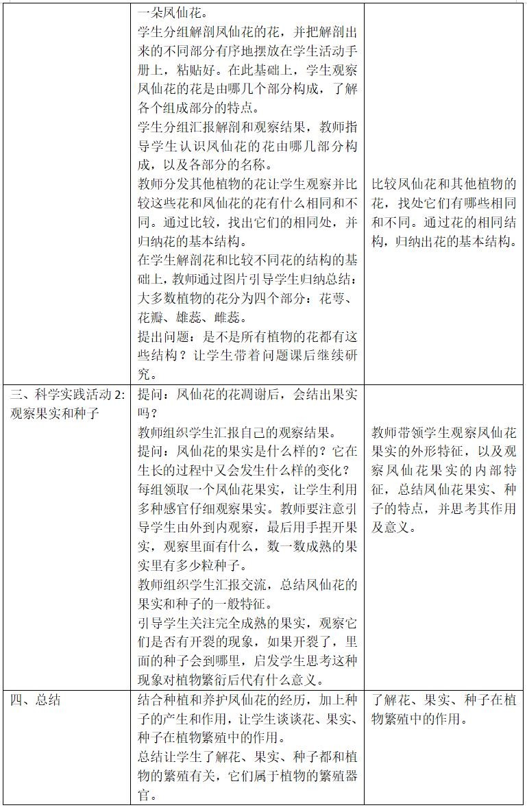 1. 能够运用简单的工具解剖凤仙花,能够运用语言和图画描述凤仙花的结构。