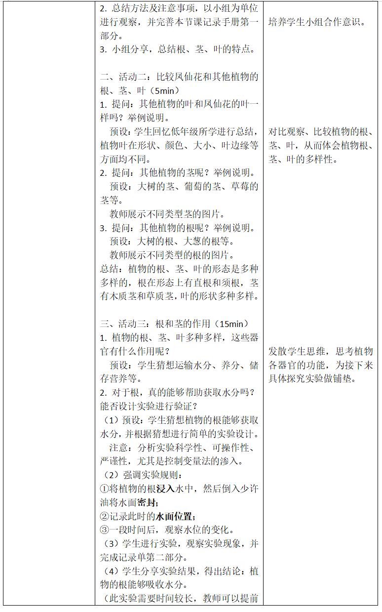 1. 能够综合运用感官和借助简单的工具从多方面观察凤仙花的根、茎、叶。