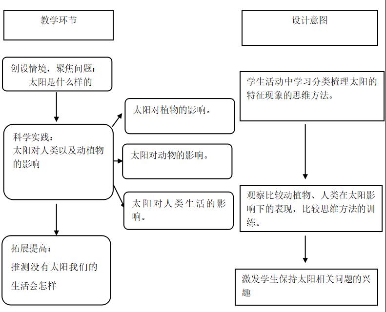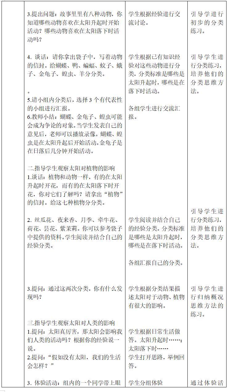 主要培养的思维方法为比较和分类,选取的重点活动是:引导学生分类整理太阳对动植物影响的具体情况,并尝试用语言描述;尝试归纳出太阳的基本特征和其对动植物及人类生活的影响。