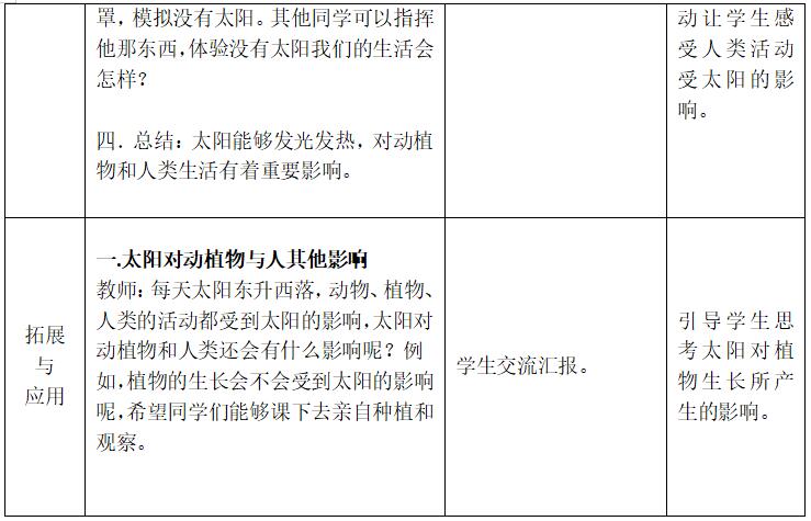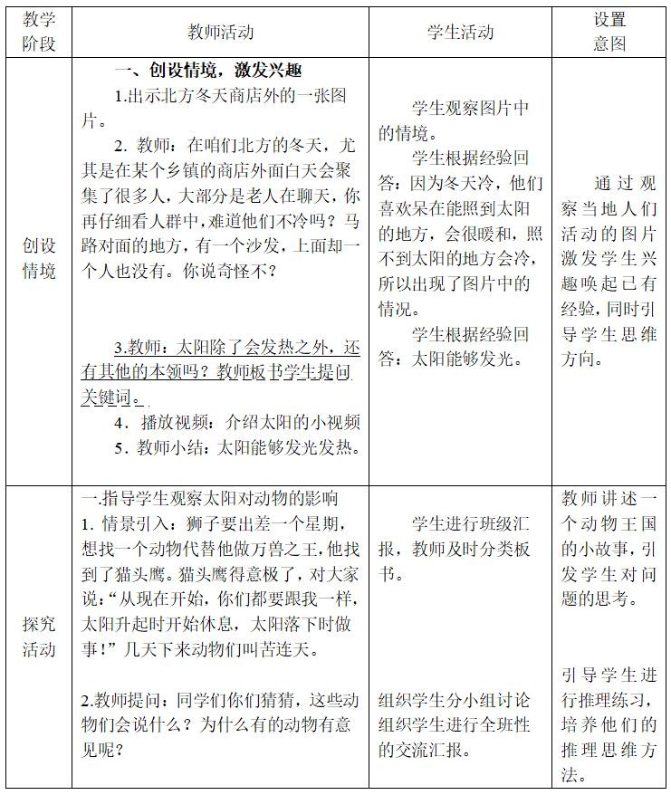 教学重点:学生基于实际观察和生活体验,能描述太阳每天在天空中东升西落的位置变化,说出太阳能够发光发热,描述太阳对动植物和人类生活有着重要影响。