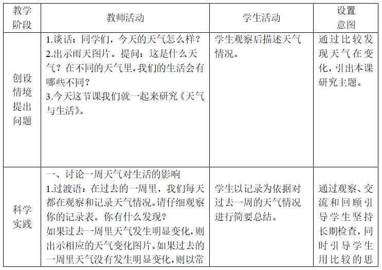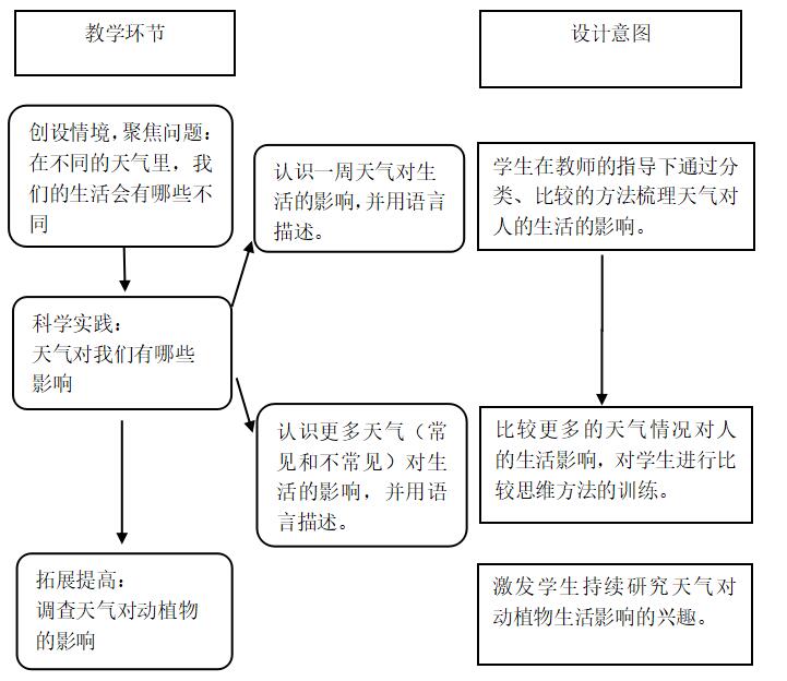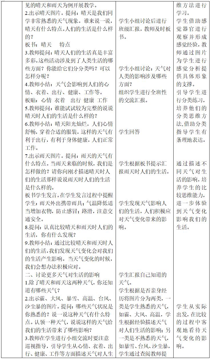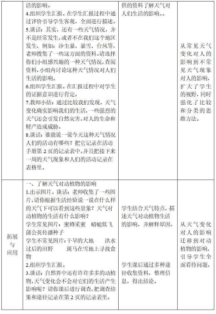 教学重点:学生在教师指导下,如实讲述亲自观察到的天气变化对人类生活和动植物的影响,培养学生的比较和分类能力。