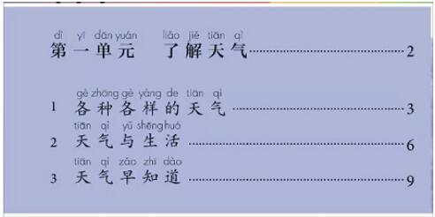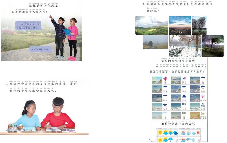 第1课是《各种各样的天气》。通过观察日常的天气情况、回顾生活中出现过的具体天气现象,使学生认识到阴、晴、雨、雪、风等是自然界常见的天气现象。虽然每种天气现象都具有各自的特征,如晴天时阳光普照、万里无云;雨天时风雨交加、电闪雷鸣,但是可以从一些共同的角度来描述天气现象。根据这些描述天气现象的角度,学生可以设计表示不同天气现象的符号,并尝试用这些符号记录一周的天气现象。