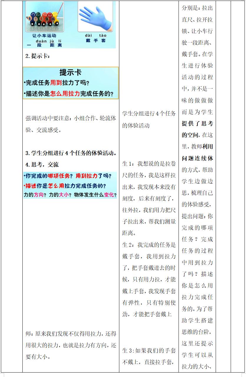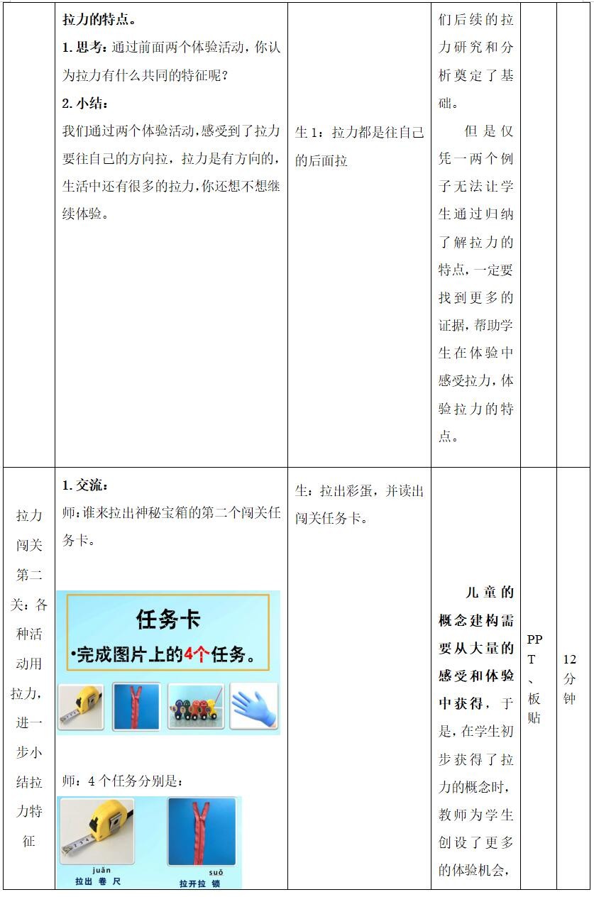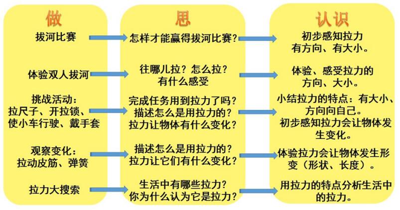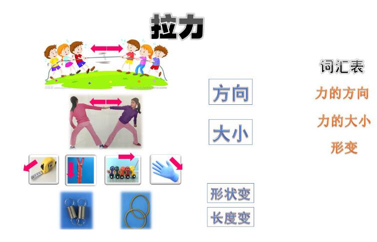 层次2:通过体验和探究意识到:拉力有大小和方向,并了解拉力的方向永远是朝向自己的。能够运用拉力来解决实际生活中的问题,并通过记录的方式将拉力使物体发生的变化记录下来。
