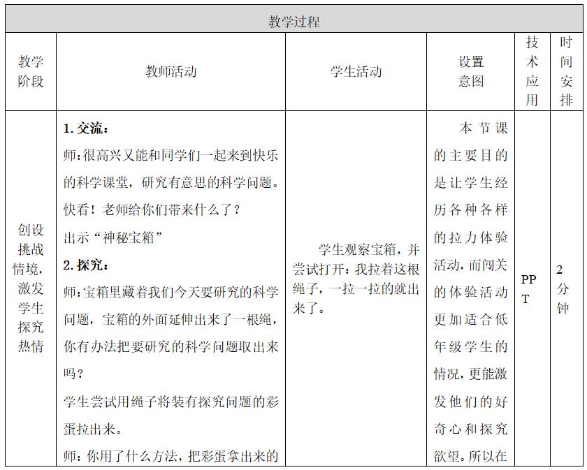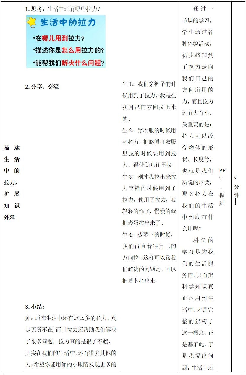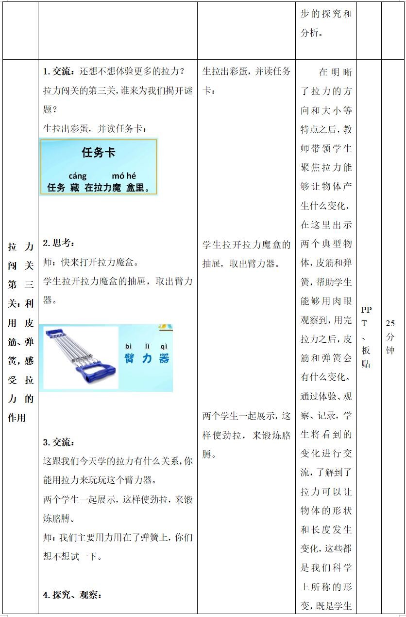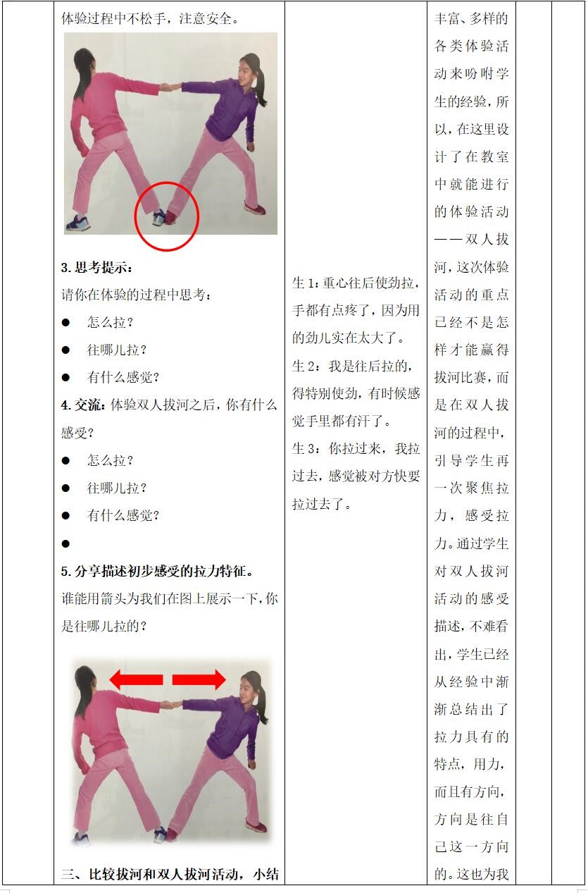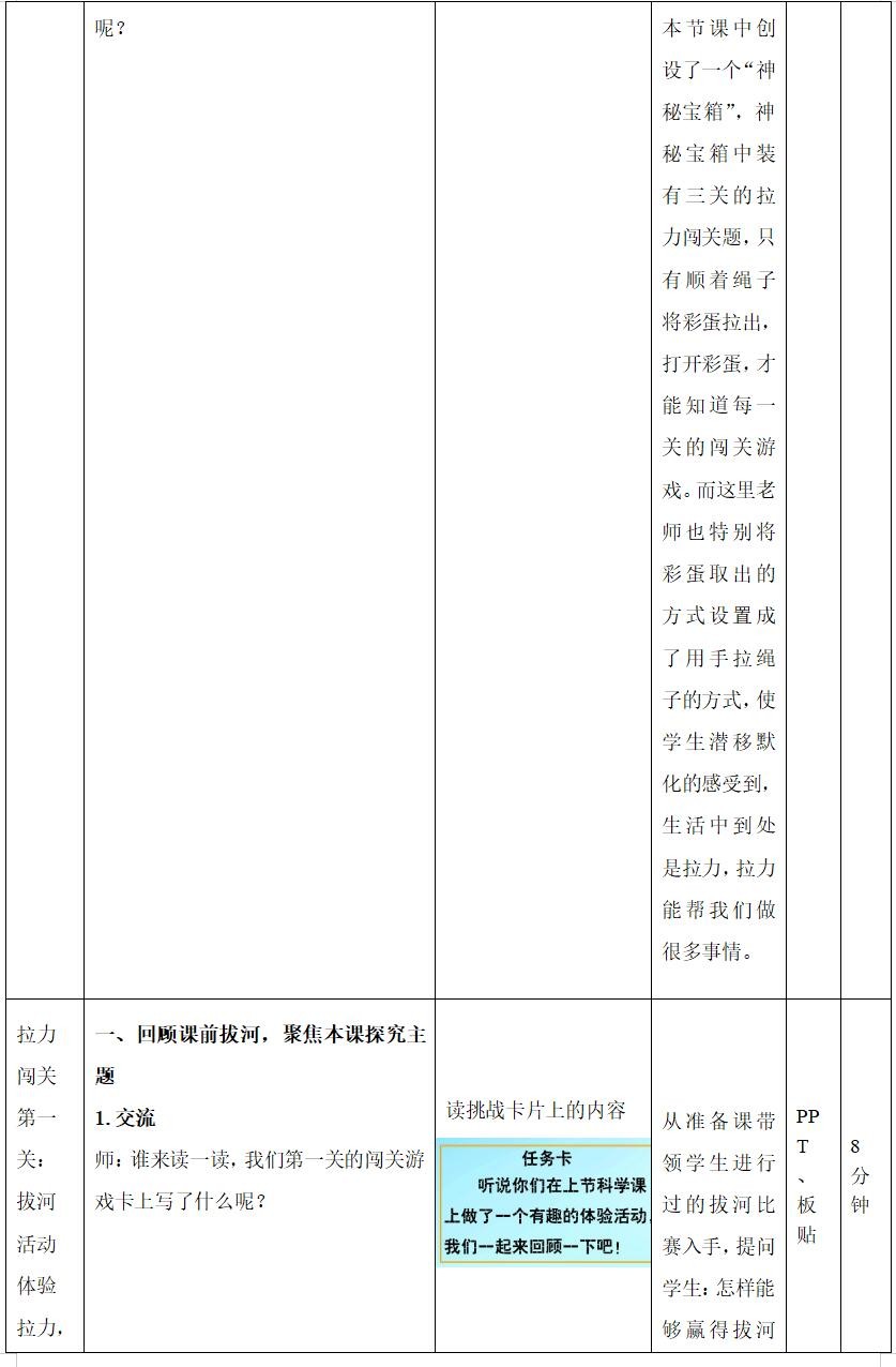 教学重点:学生在教师的指导下,利用简单的工具,对拉力进行多种体验。