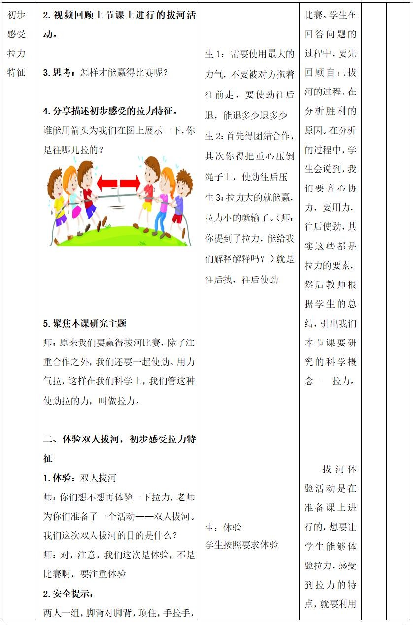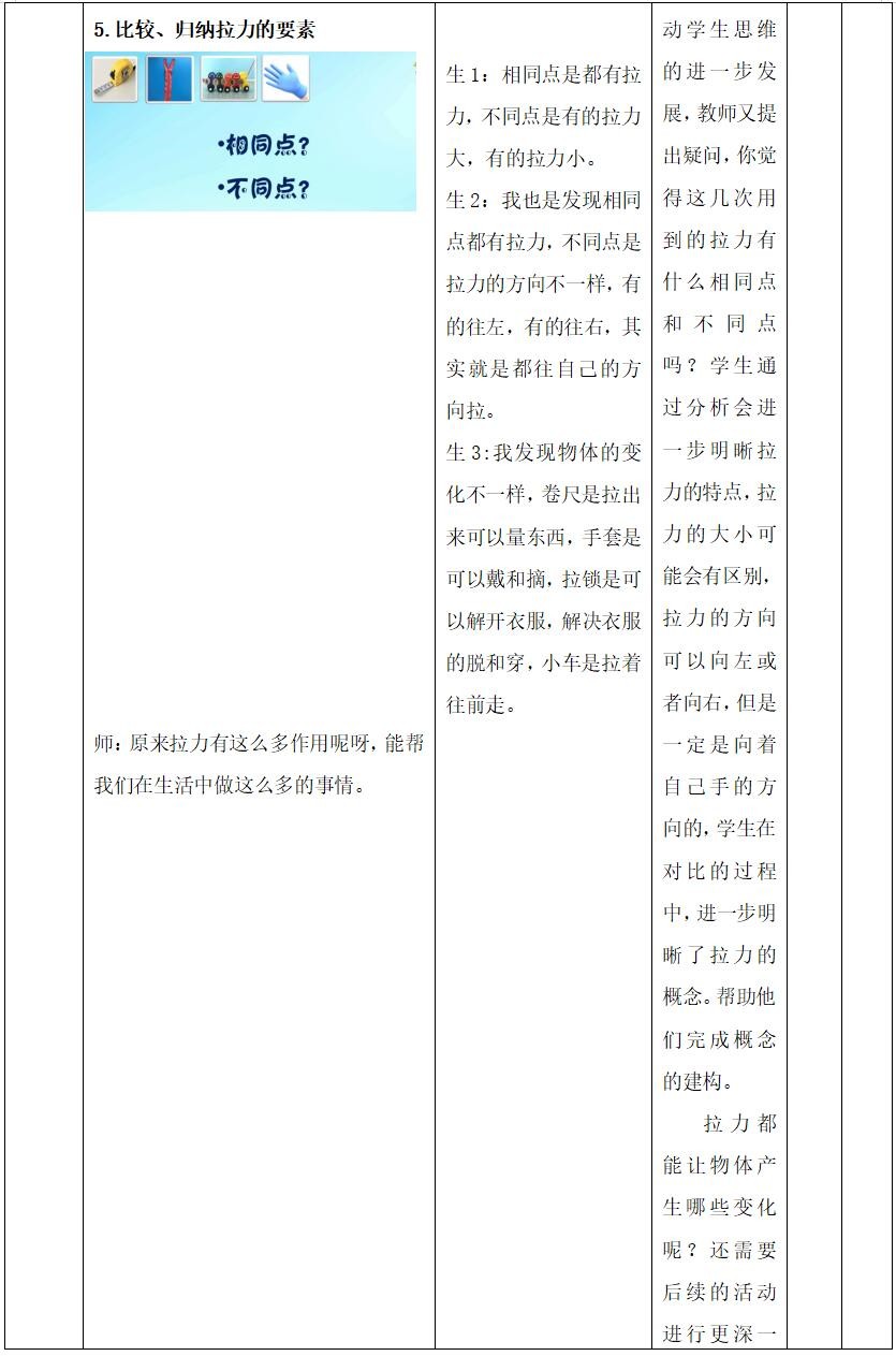 教学难点:学生在教师指导下,用语言描述拉力的特征。并通过观察与描述、比较与分类等方法总结拉力的特征。