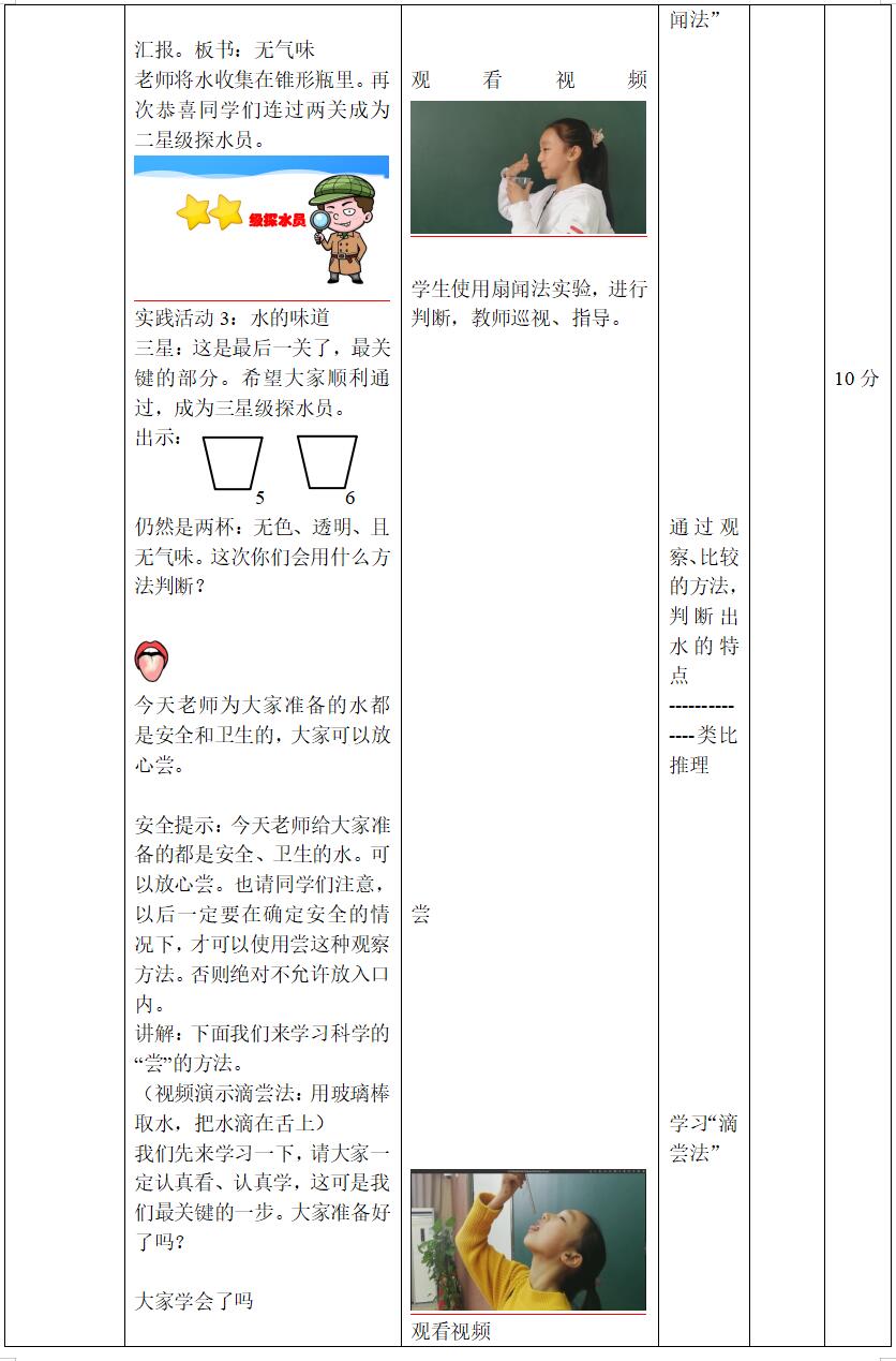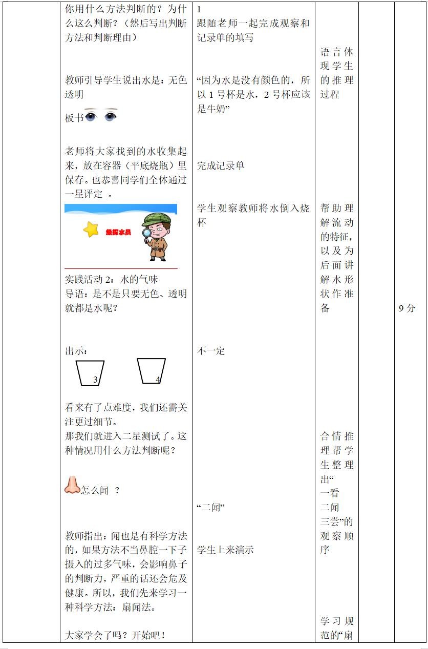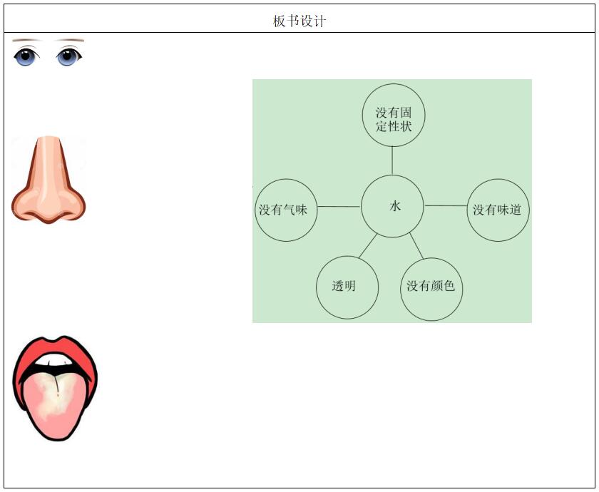 1.知道水没有颜色、没有气味、没有味道、没有固定形状等特征。