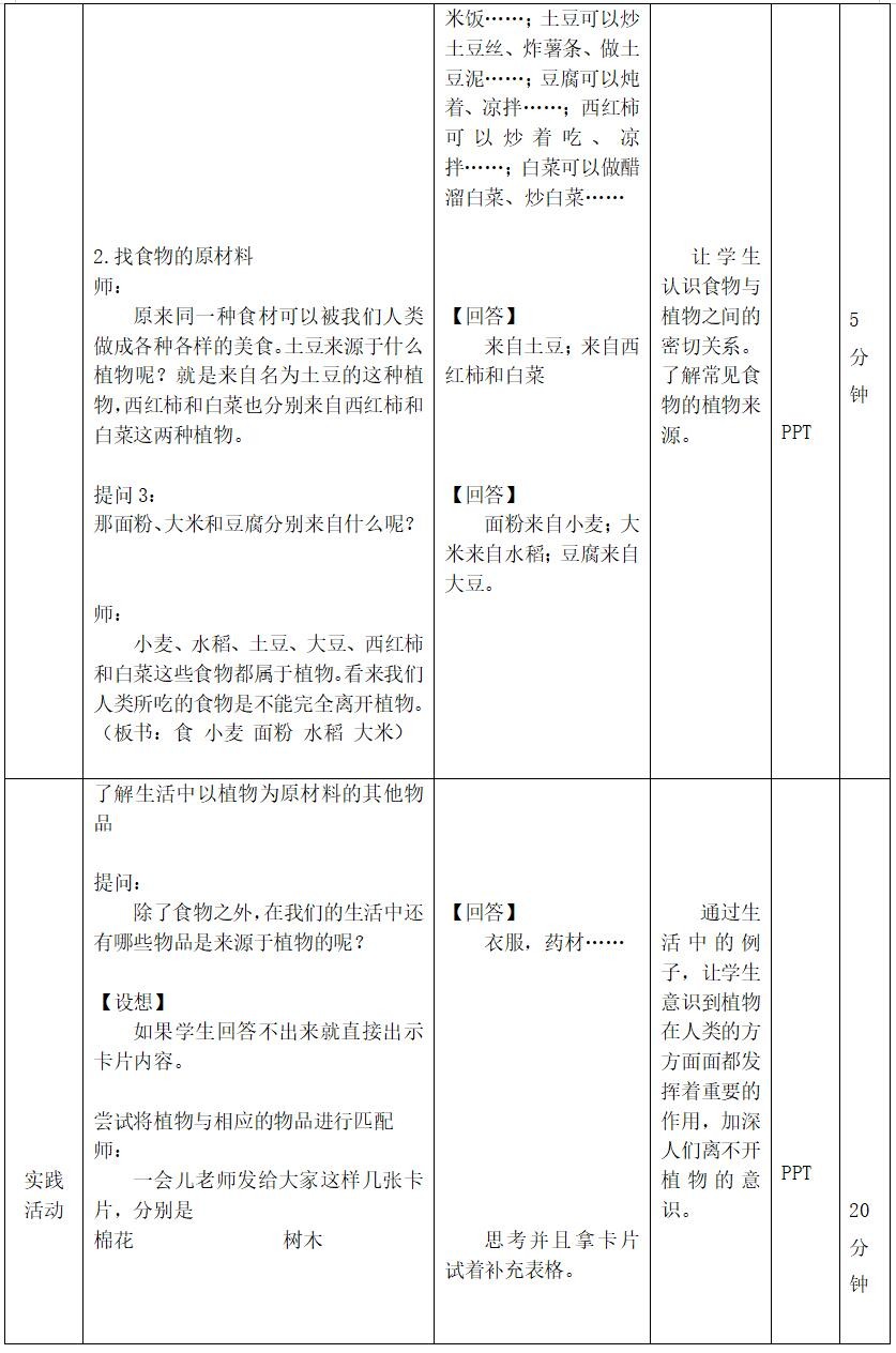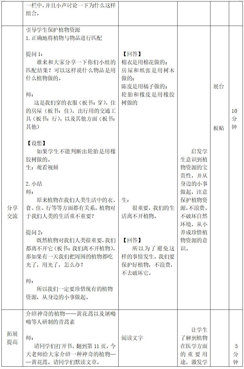 教学重点:了解植物在人类生活的衣、食、住、行等方面都发挥着重要作用。