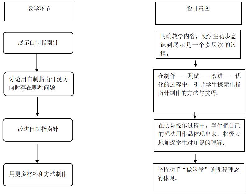 学生通过展示自制指南针,完成完整表达自己设计意图的任务,以及合理改进自制指南针。