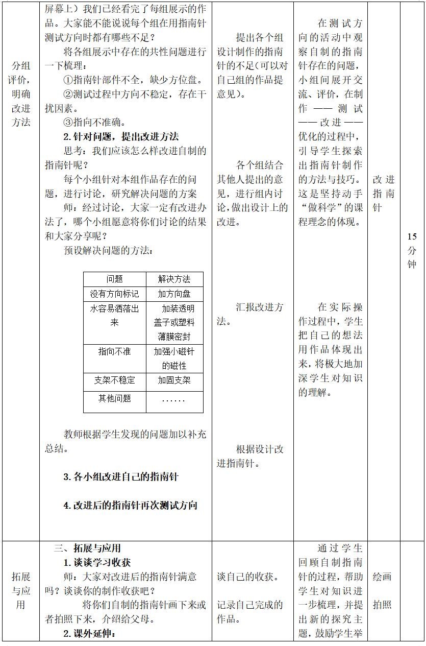 教学难点:在展示指南针的活动中,能对自己和他人制作的指南针提出改进意见。