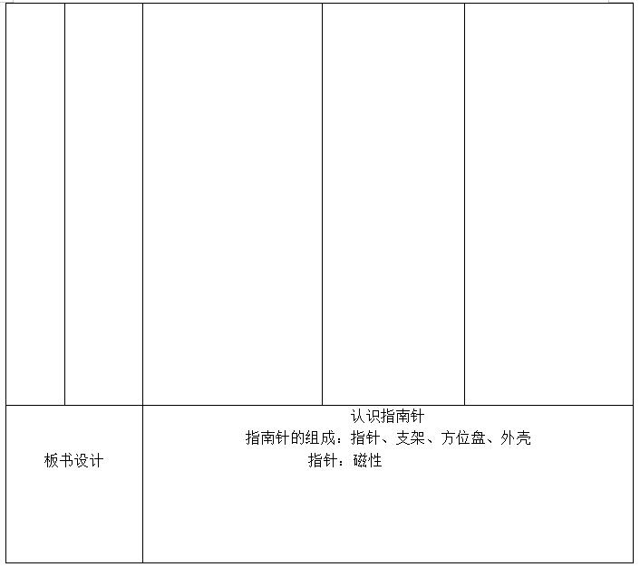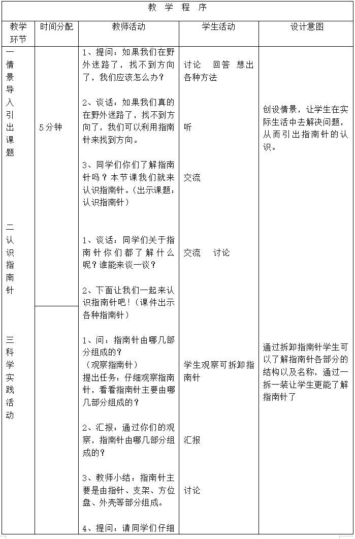 一、知识与技能:能通过对指南针结构的观察,说出指南针的主要组成部分。