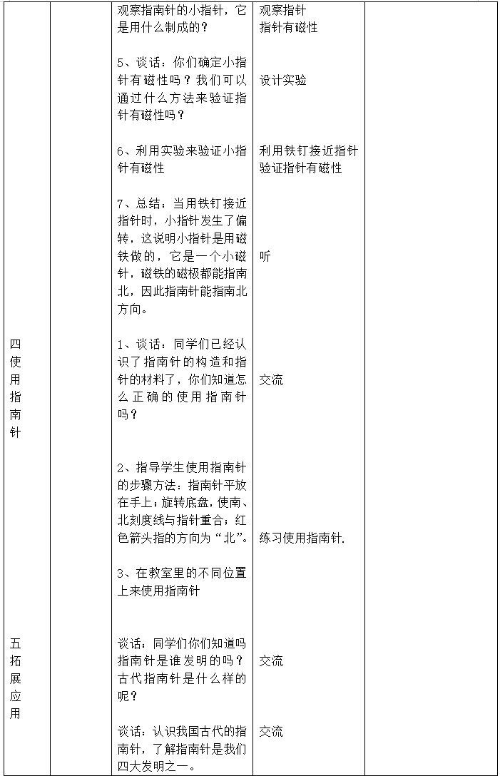 二、过程与方法:能通过实验,认识到指南针中的指针是一个小磁针,具有磁铁的性质,可以指南北方向。